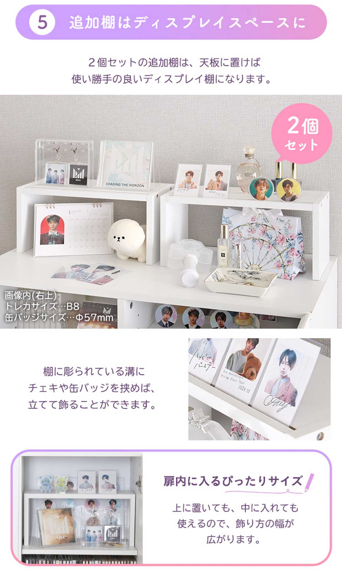 付属の2つの追加棚は、棚上に置いて使用でき、棚に彫られた溝にチェキや缶バッジなどを飾るのに便利です。また、キャビネット内にもぴったり収まる設計なので、すっきり見せたい場合はキャビネット内でもお使いいただけます。