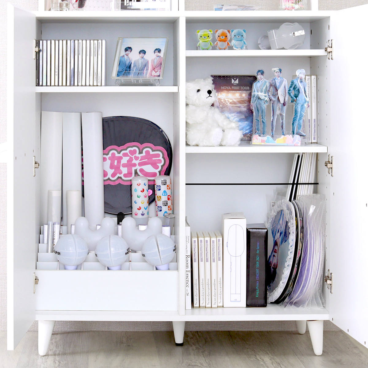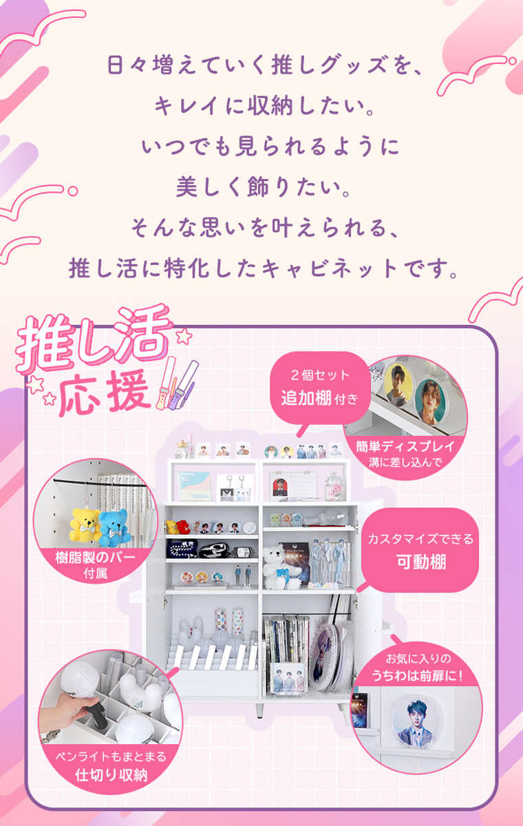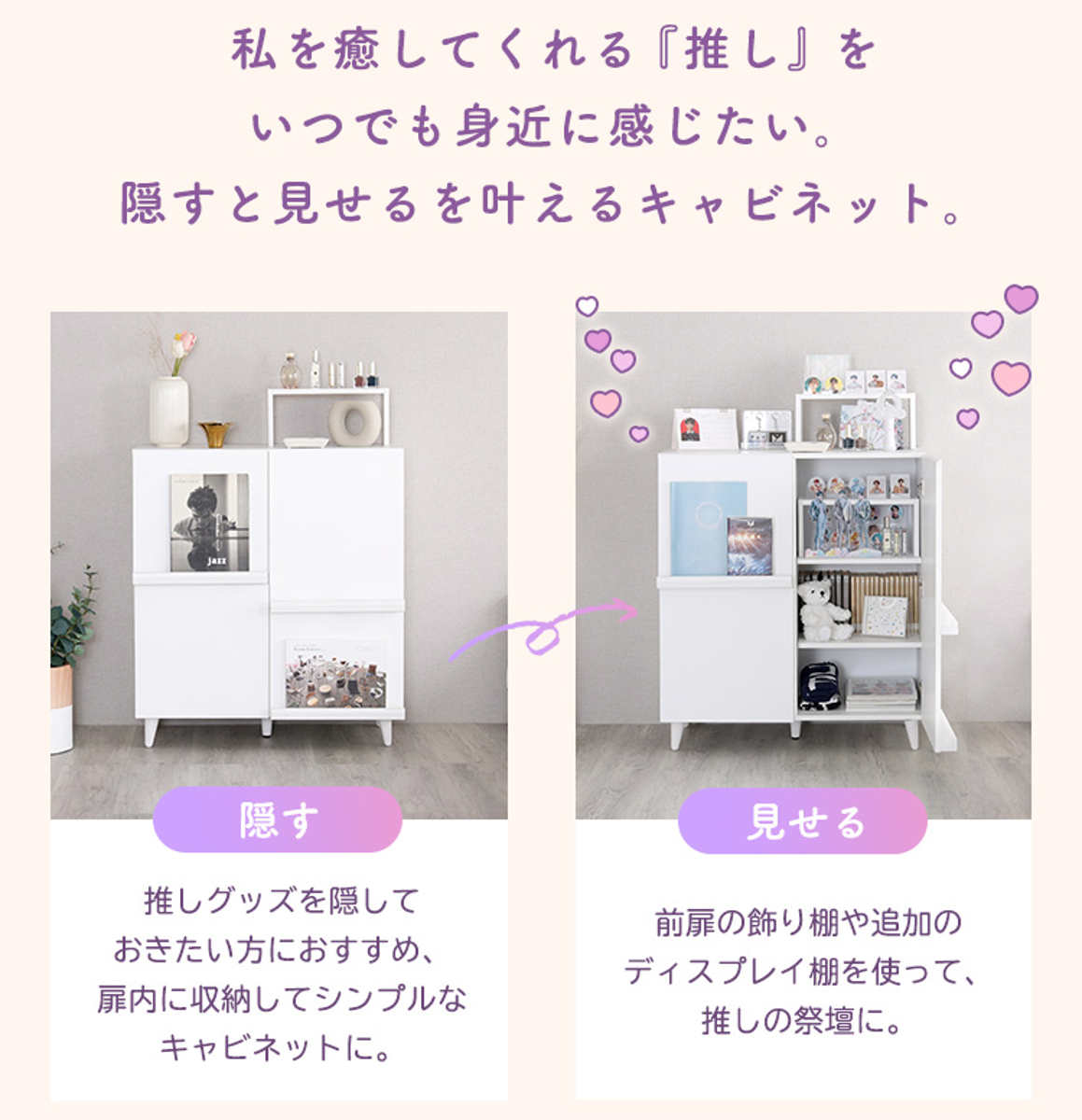 尊い「推し」を身近に感じられるような、推しグッズがたっぷり収納できるキャビネットです。さまざまなタイプの推しグッズを飾れたり、ひとまとめに収納できる工夫がたくさんあるので、グッズを大切に扱いたい方も、飾って楽しみたい方にもおすすめです。