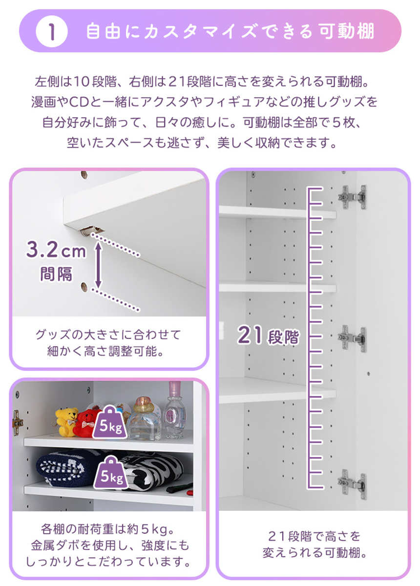 左側は10段階、右側は21段階に高さを変えられる可動棚が付いています。漫画やCD、アクスタやフィギュアなどの推しグッズの高さに合わせて棚の設置が可能です。