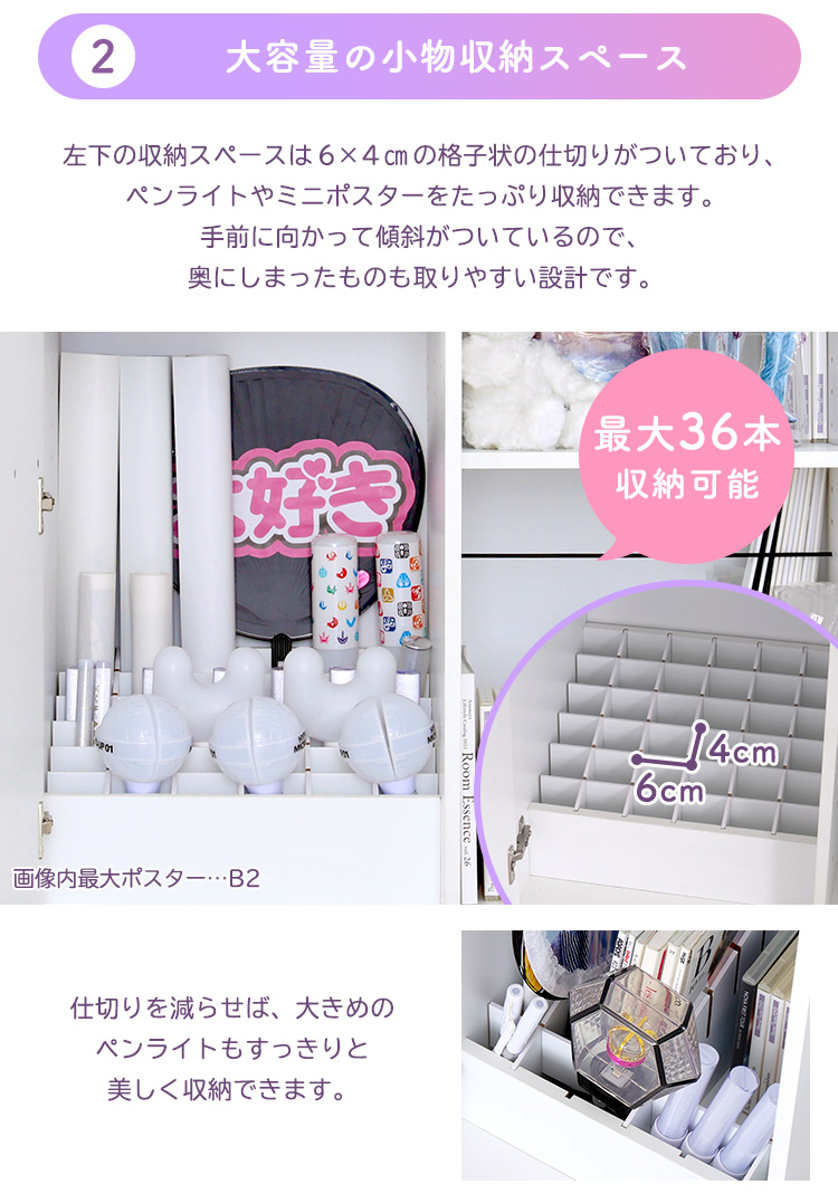 左側の収納スペースは6×4cmの格子状の仕切りが付いており、ペンライトやミニポスターをたっぷり収納できます。手前に向かって傾斜が付いているので、奥にしまった物も取り出しやすい設計です。