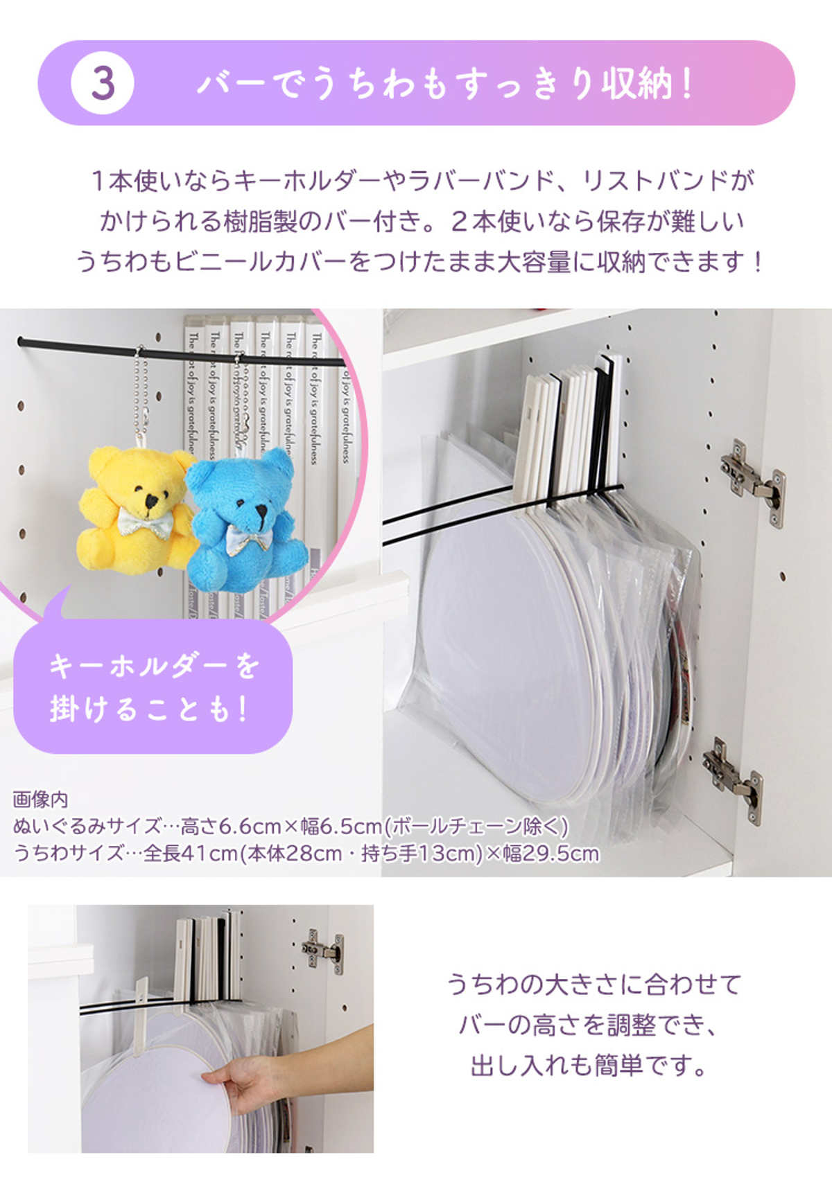 グッズの収納に便利な樹脂製のバーが付いています。1本使いならキーホルダーやラバーバンド、リストバンドを掛けるのに便利です。2本使いなら保存が難しいうちわもビニールカバーを付けたまま、たっぷり収納できます。