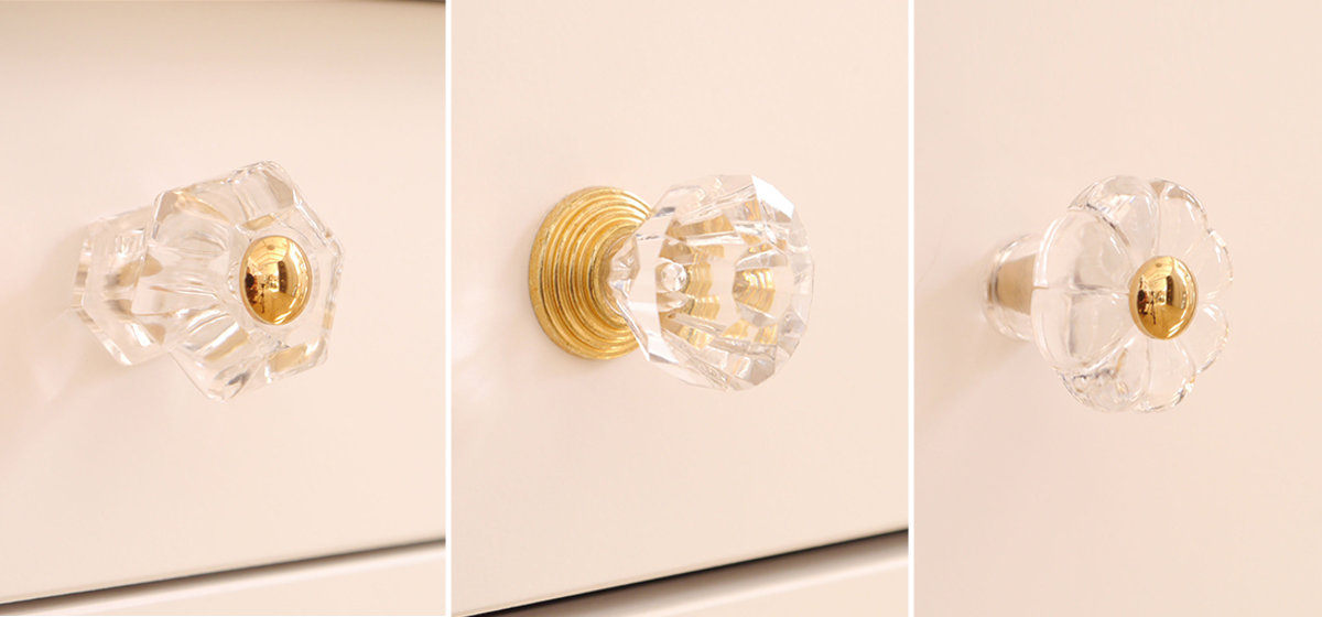 引出しの取っ手には3種類のキラキラのクリスタル風取っ手を採用。シンプルながらも存在感があり、お部屋のアクセントとしても映えるデザインです。