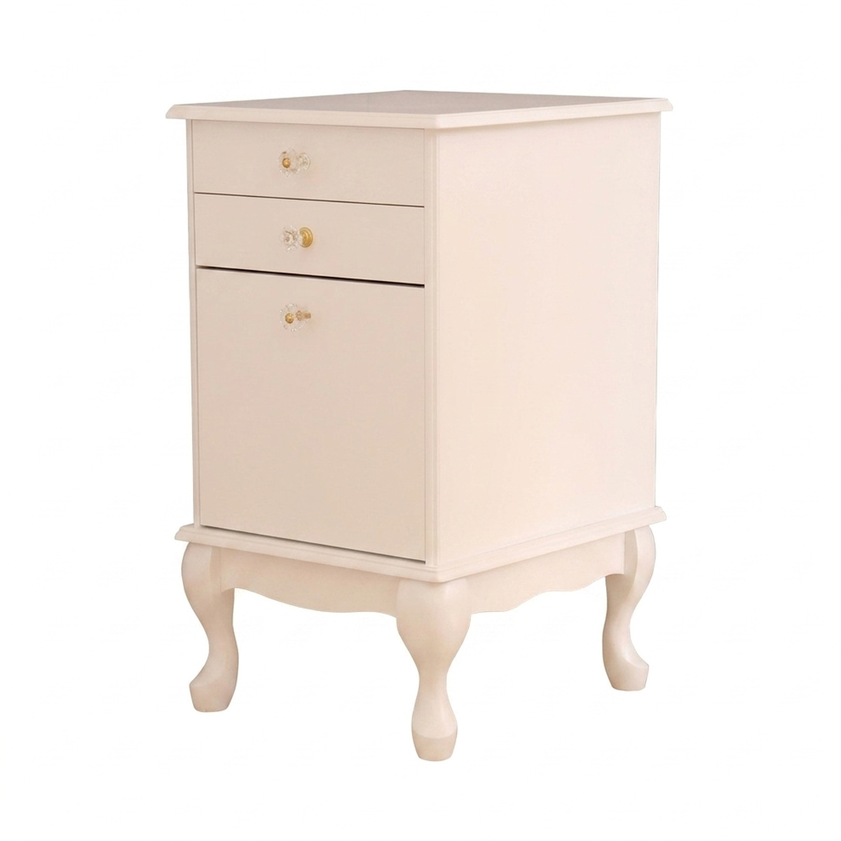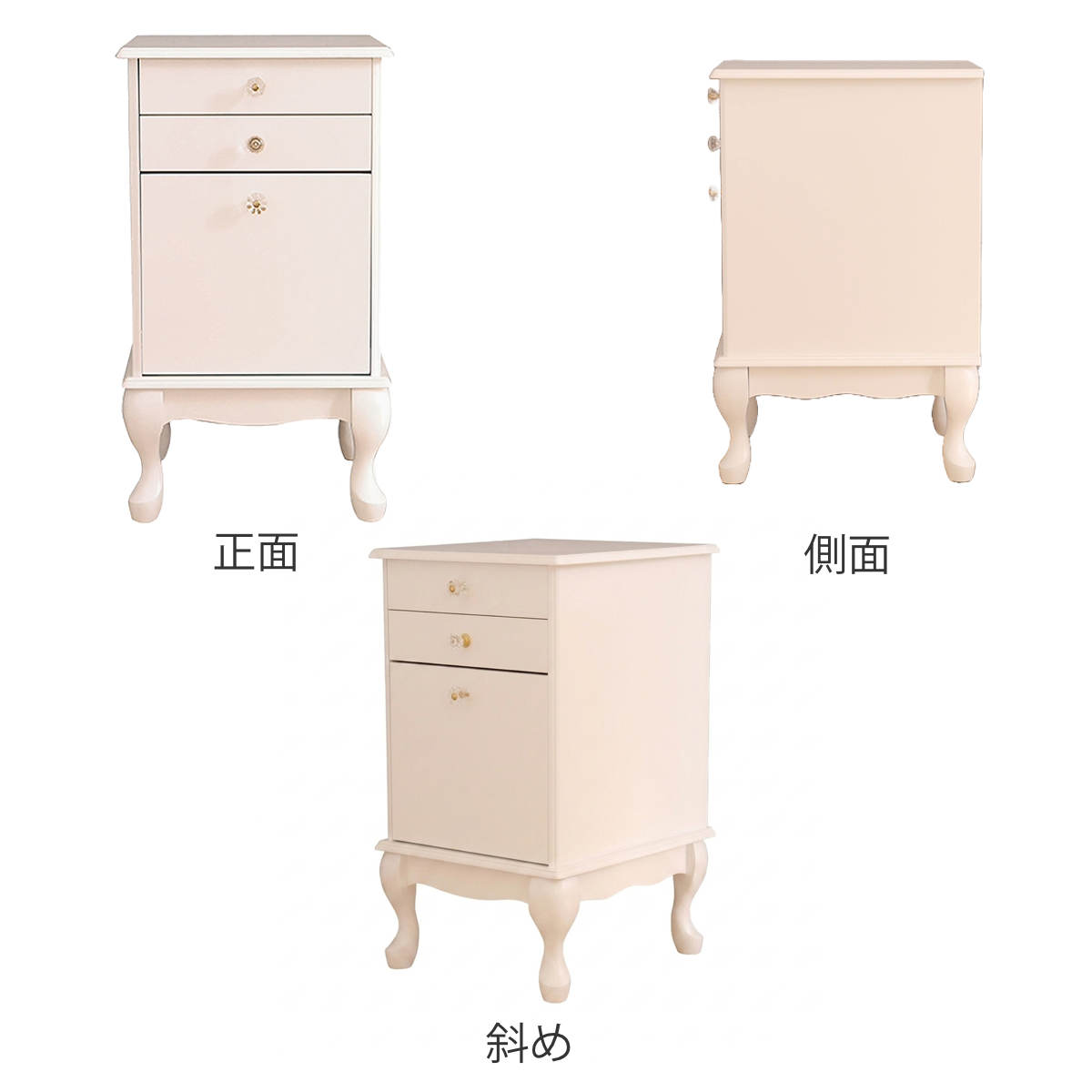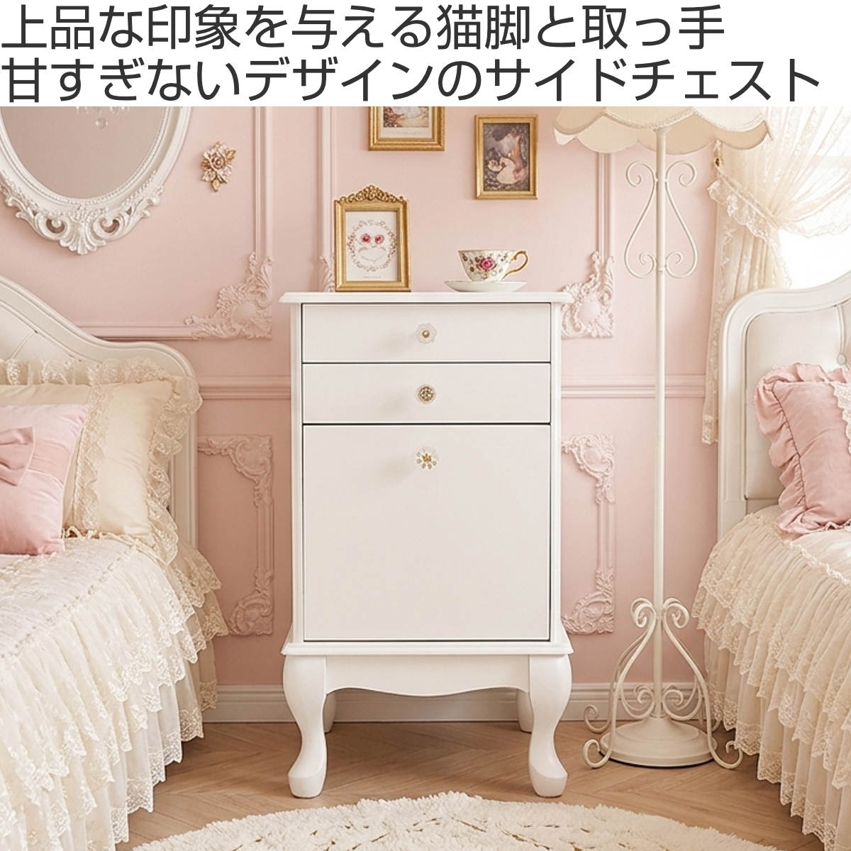 上品で優しい印象のサイドチェストです。小ぶりなサイズ感と猫脚が愛らしく、大人の女性でも使いやすいデザインです。フラットな天板なので、ベッドやソファサイドでナイトテーブルとしてもお使いいただけます。