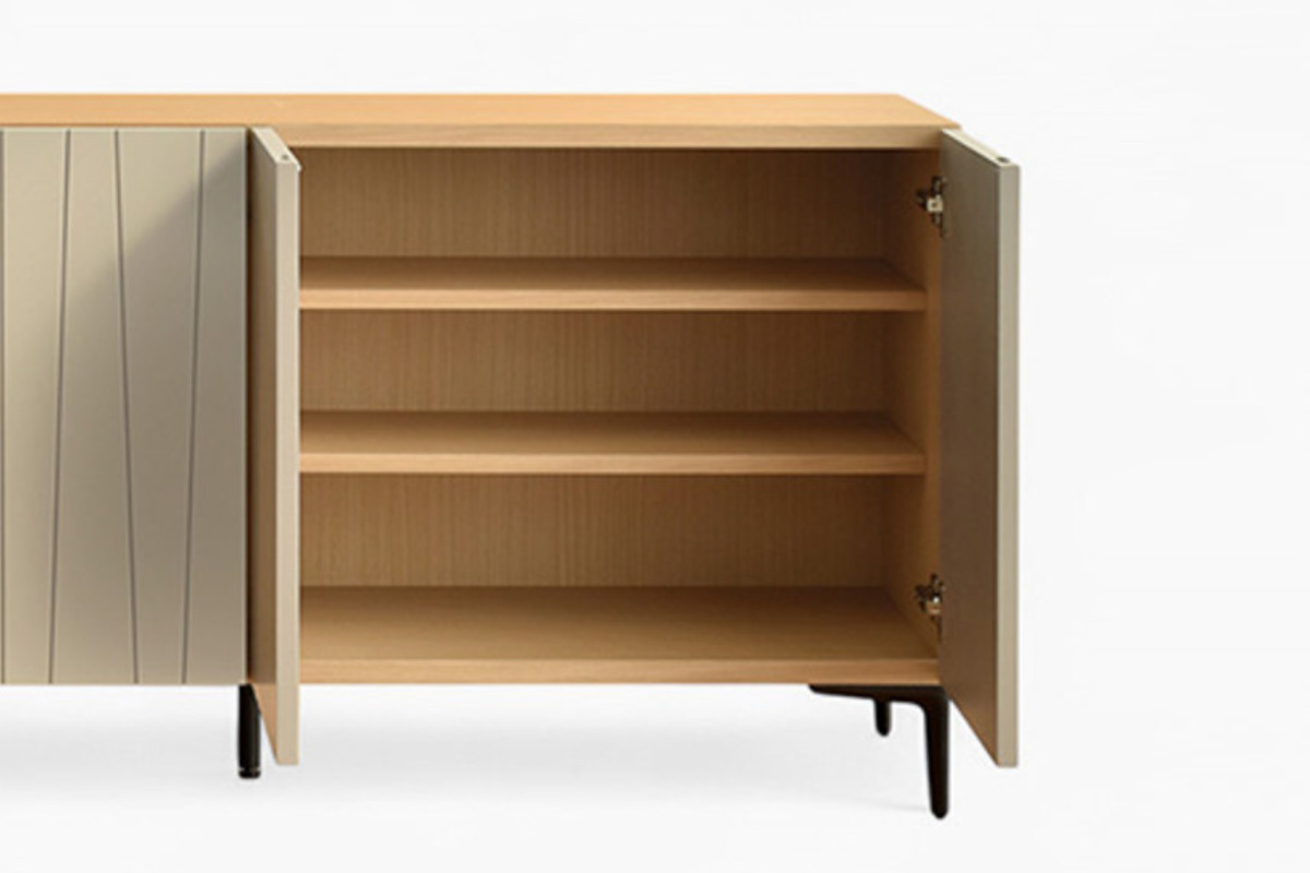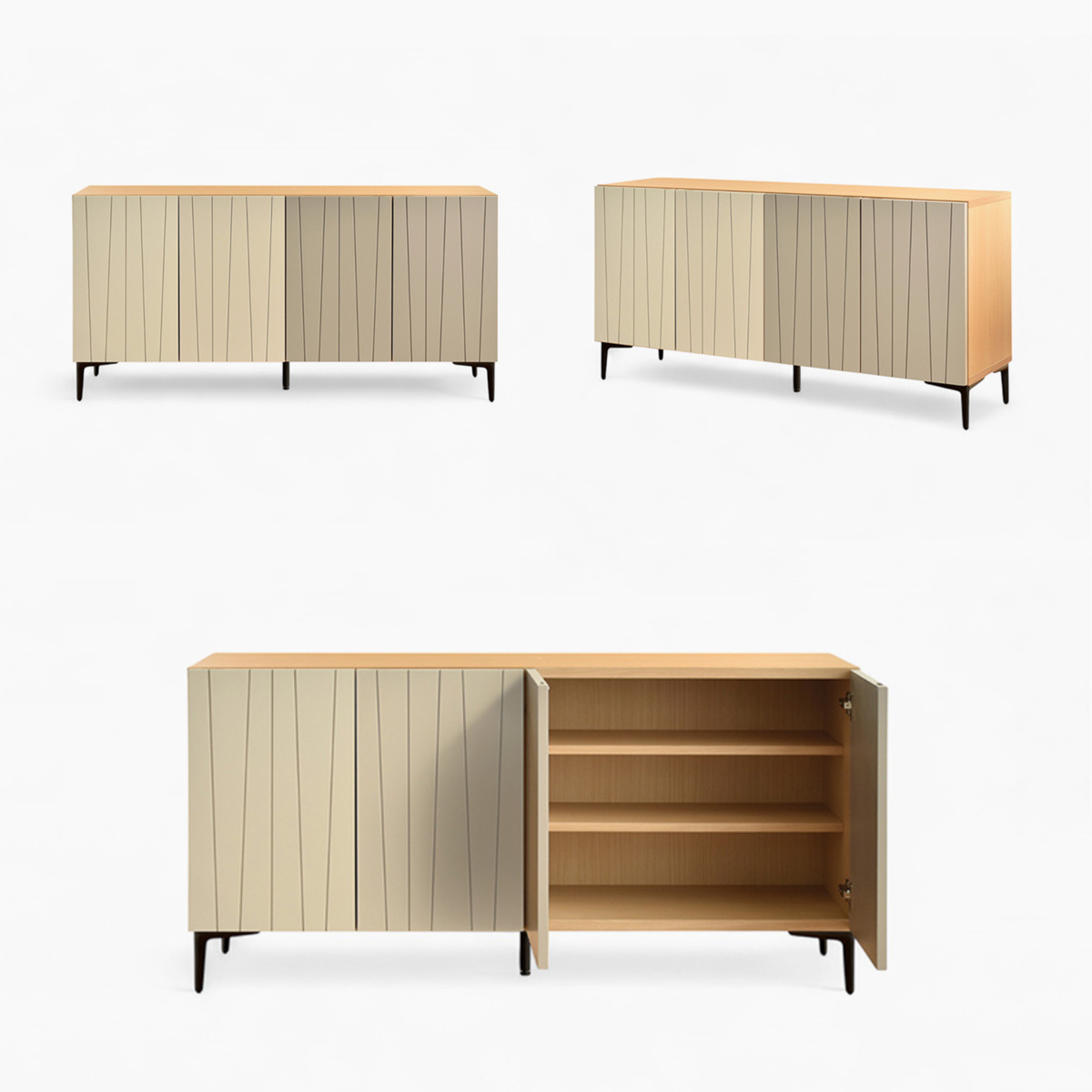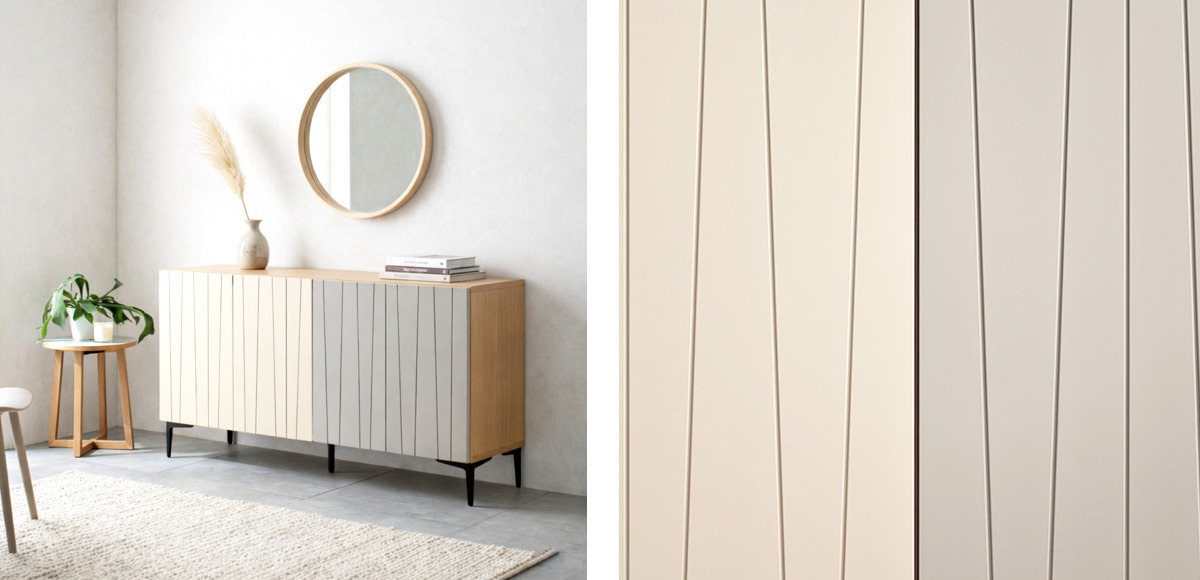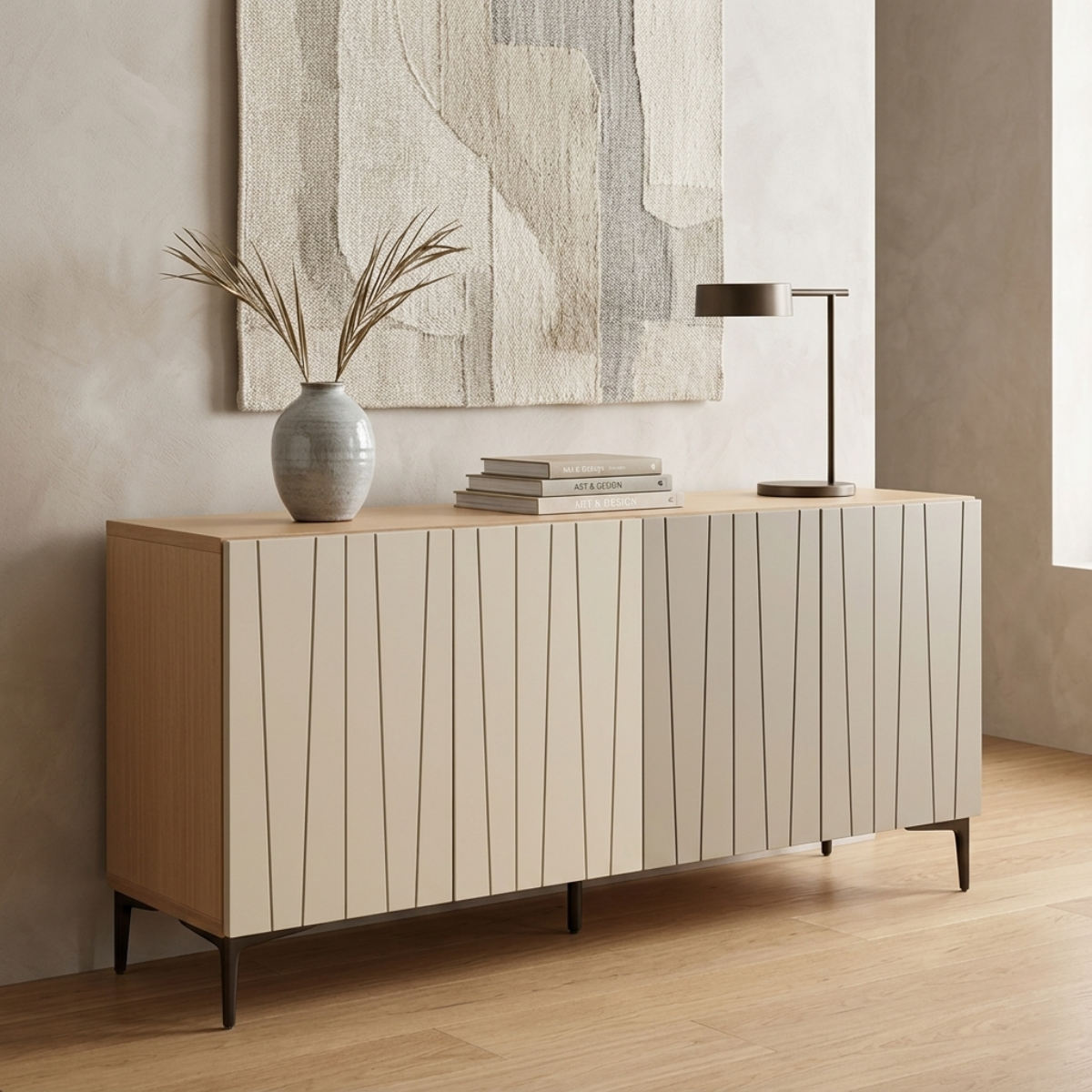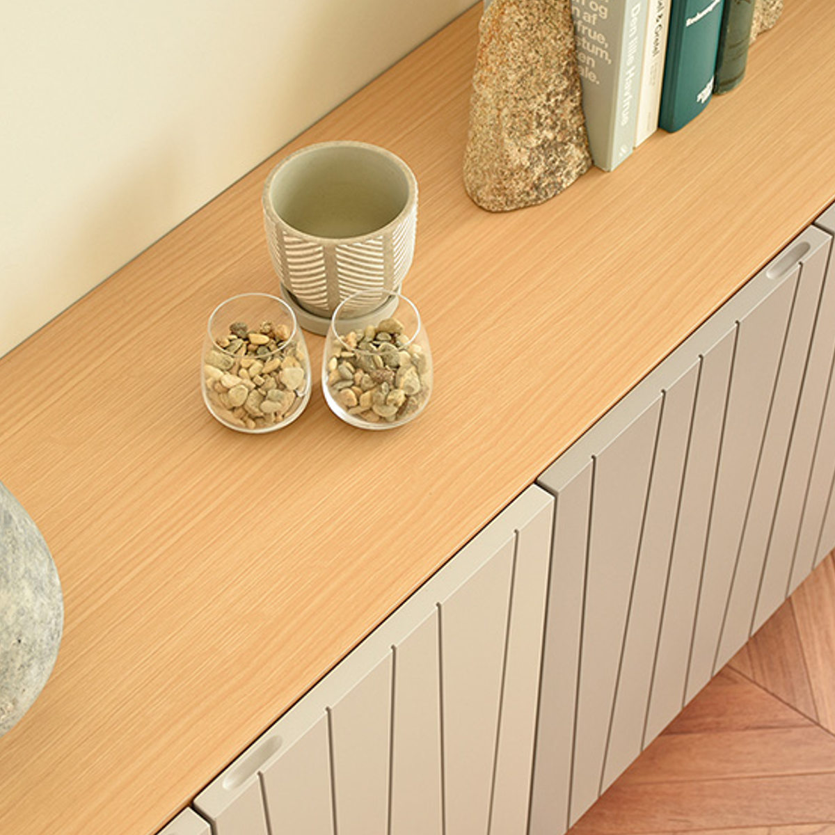 ナチュラルな木目と、縦ラインが美しいフロントデザインが印象的なサイドボードです。主張しすぎないやわらかな色合いが、リビングにすっと馴染み、上品で落ち着いた空間を演出します。
