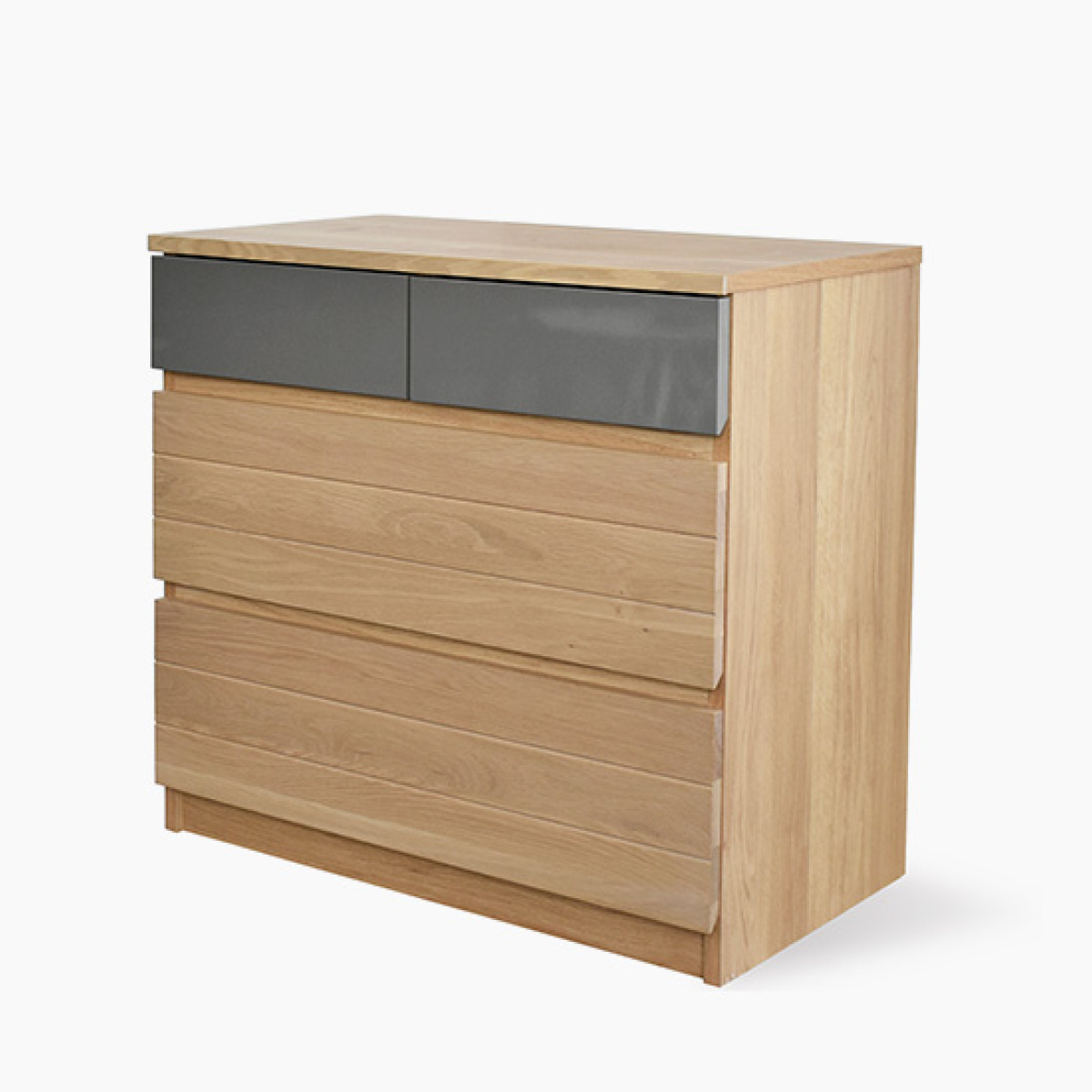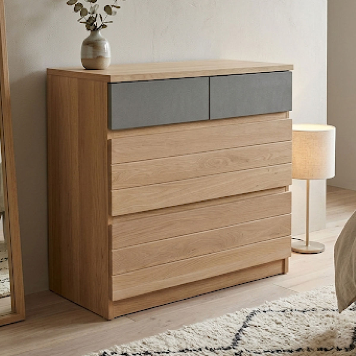 ナチュラルな木目とマットなグレーフロントを組み合わせた、洗練されたデザインのチェストです。引出しは収納力があり、衣類や小物をすっきり整理できます。リビングや寝室など、さまざまな空間に馴染みながら、使いやすさとデザイン性を両立した一台です。