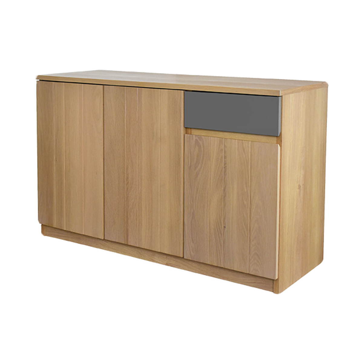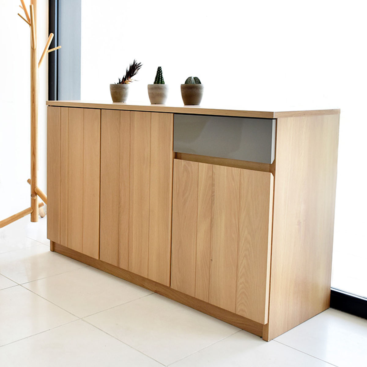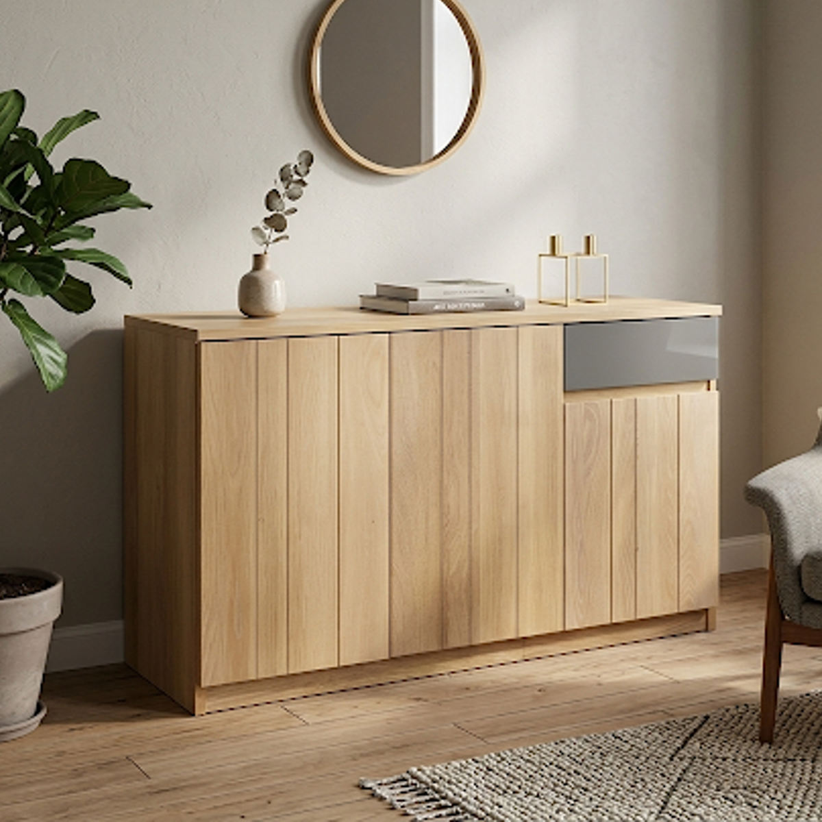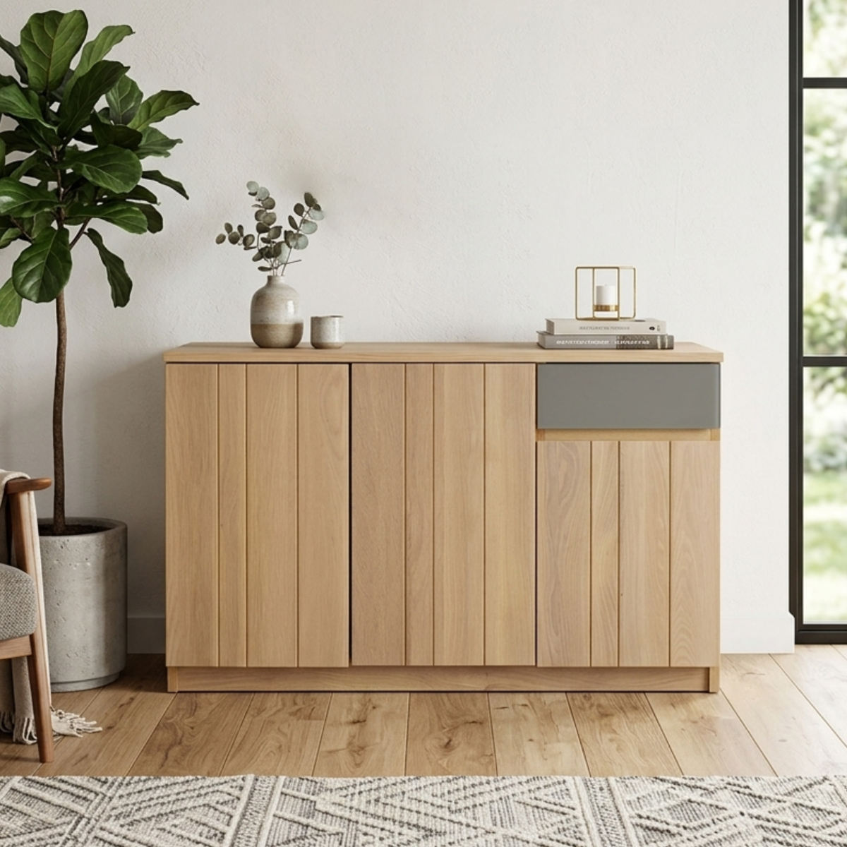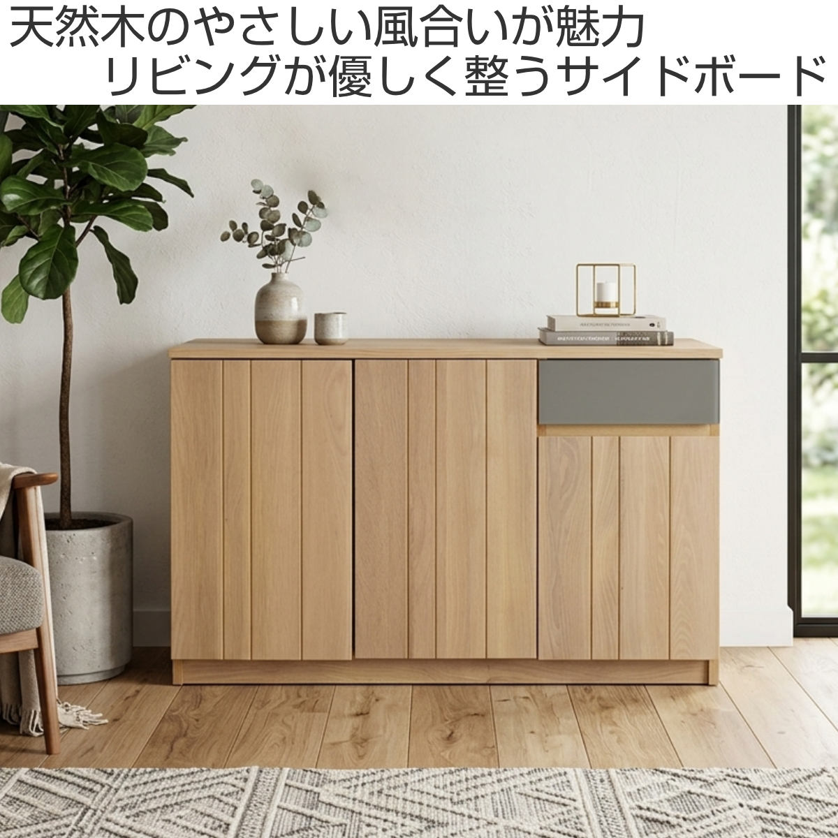 シンプルなデザインの中に、グレーカラーの引出しがさりげないアクセントになっているサイドボードです。扉内はしっかり収納できる設計で、生活感の出やすい小物や日用品をすっきりと隠してくれます。天板はディスプレイスペースとしても活躍し、お気に入りの雑貨やグリーンを飾ることで、より自分らしい空間づくりを楽しめます。