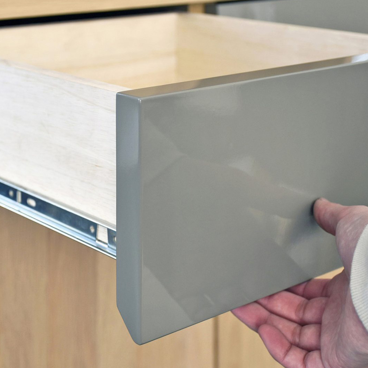 指を掛けやすい加工を施しており、取っ手がなくてもスムーズに開閉できます。見た目はすっきりと美しく、使い勝手にも配慮した設計です。