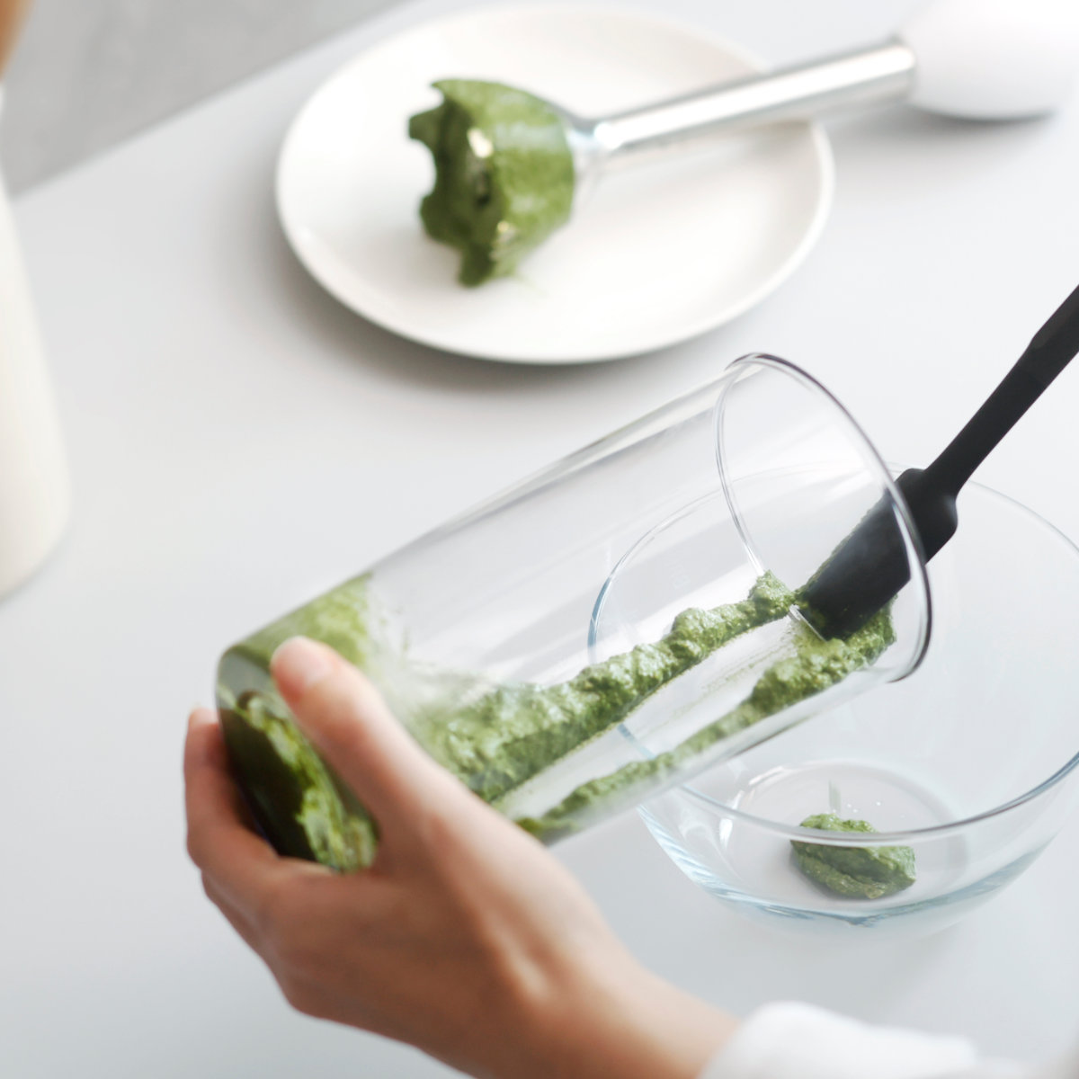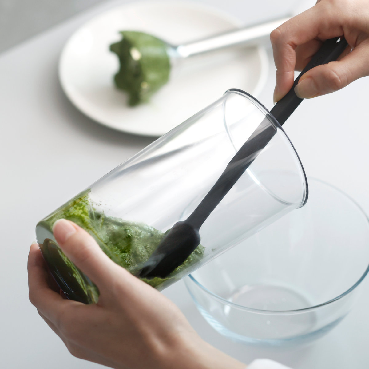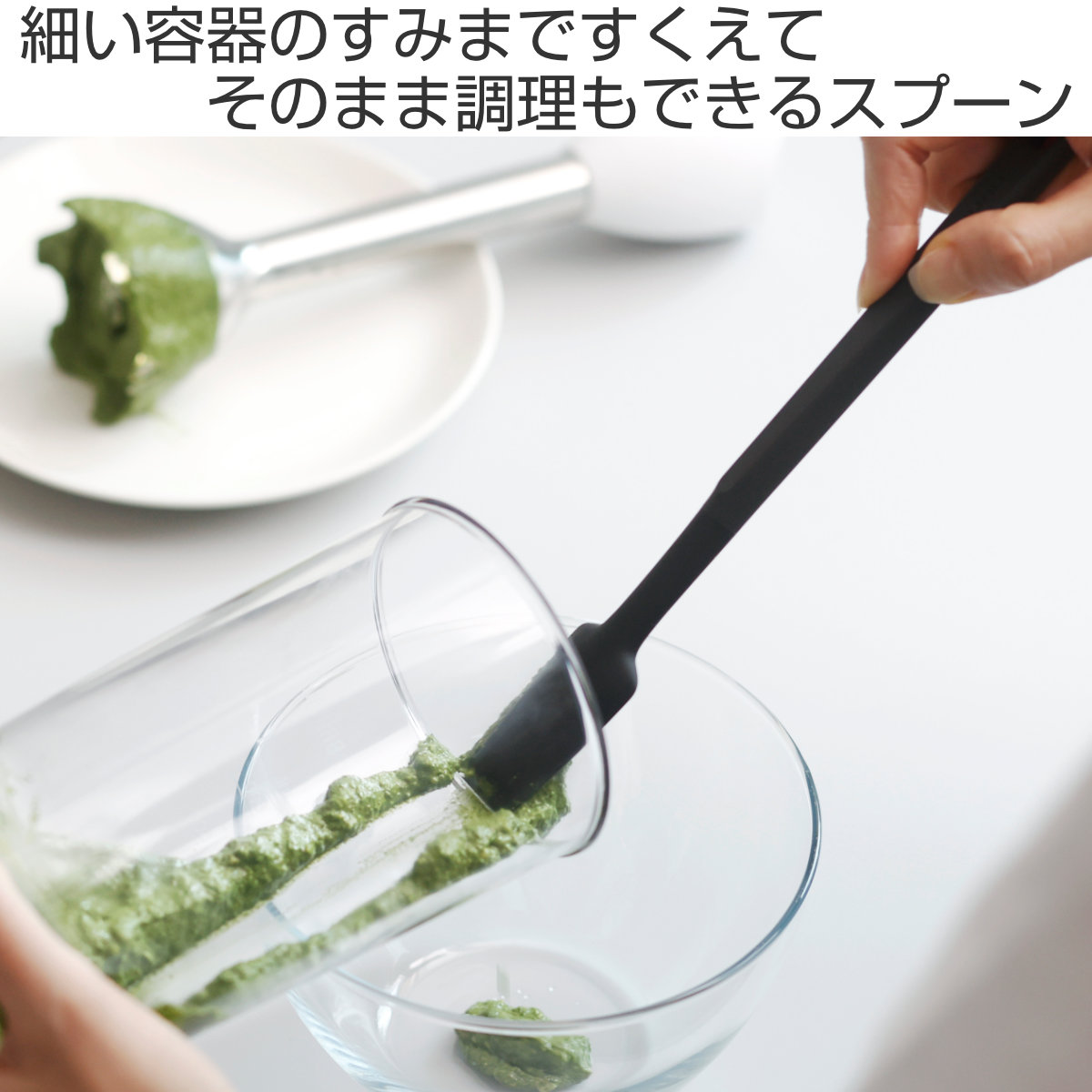 柄の長さがあるのでフードプロセッサーやジューサー、深めの鍋や容器の奥までしっかり届き、食材を無駄なくかき集められます。スリムな形状は細い瓶や狭い容器の隅までフィットし、最後のひとすくいまできれいに取り出せるのが特長です。