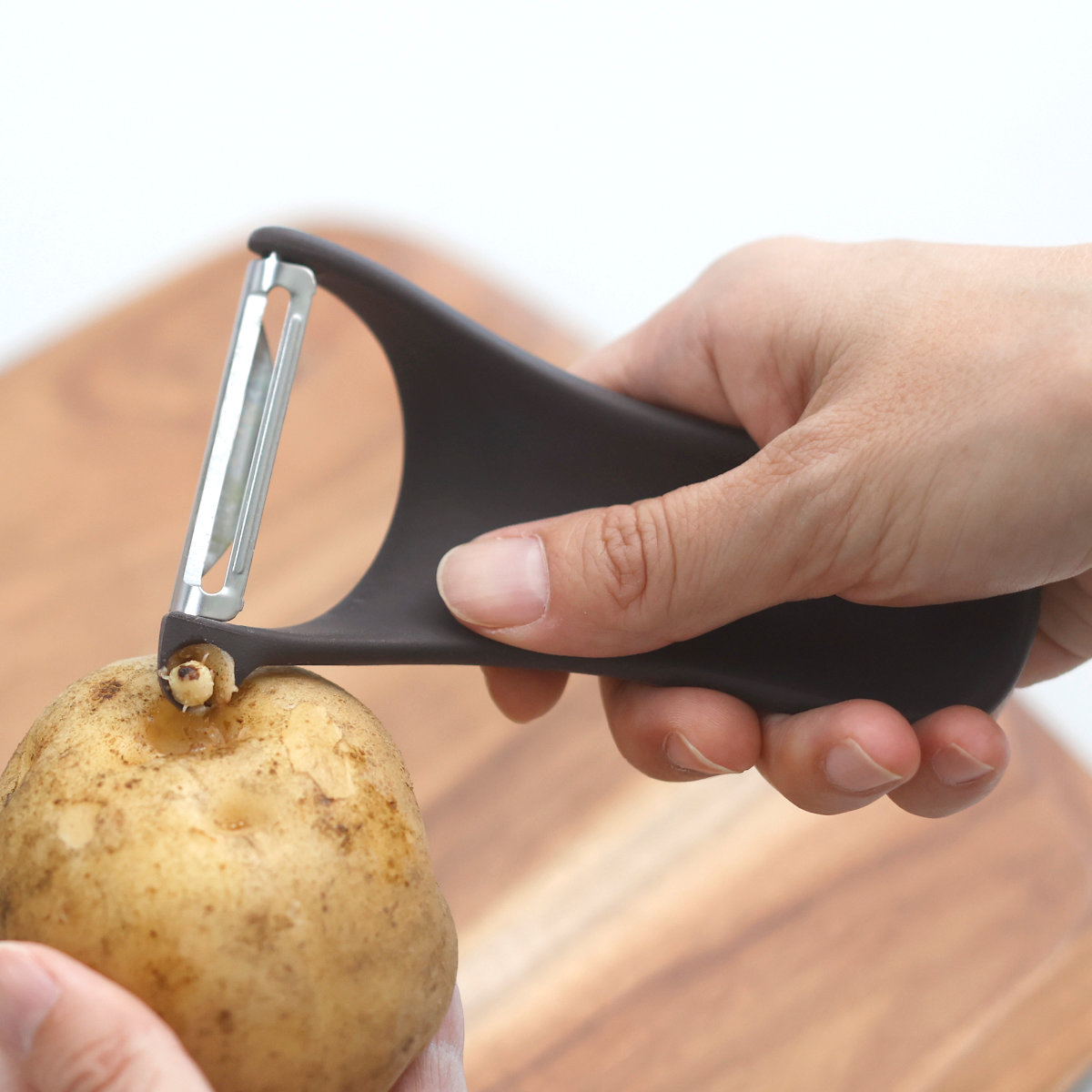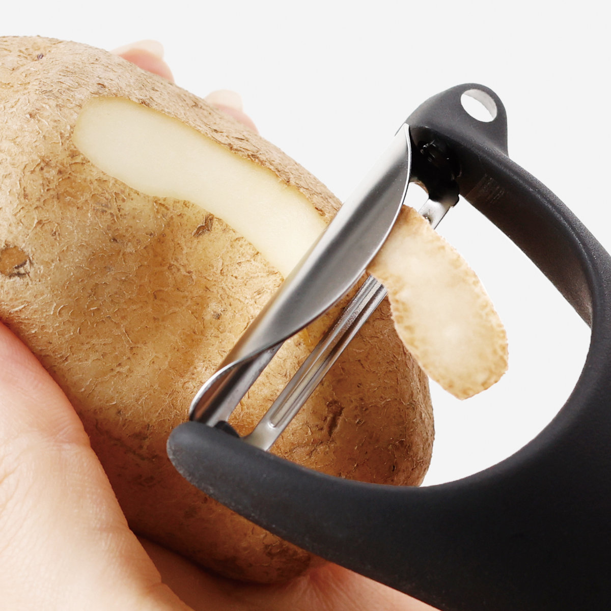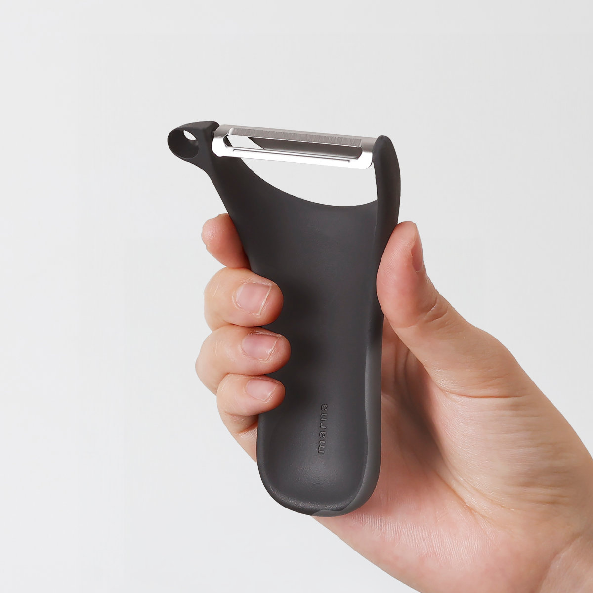 握ると裏側のくぼみに自然と指がかかり、柄全体が手のひらにフィットします。手に馴染むコンパクトな形状は動かしやすくスムーズに皮むきができます。