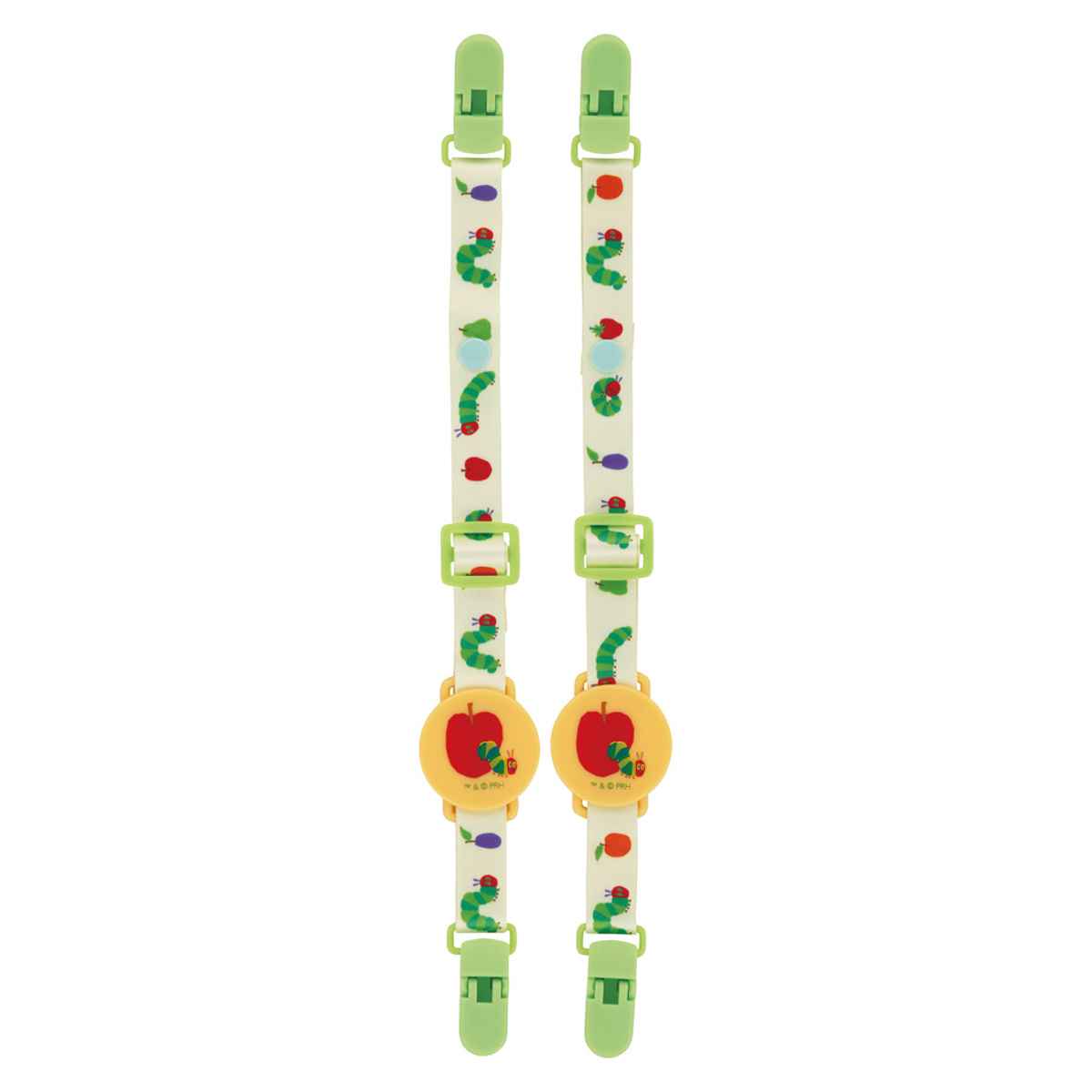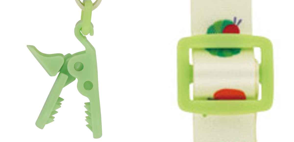 はらぺこあおむしのイラストが可愛いマルチクリップです。クリップとスナップボタンの2通りで固定できます。お出かけの際に1つあると便利なアイテムです。