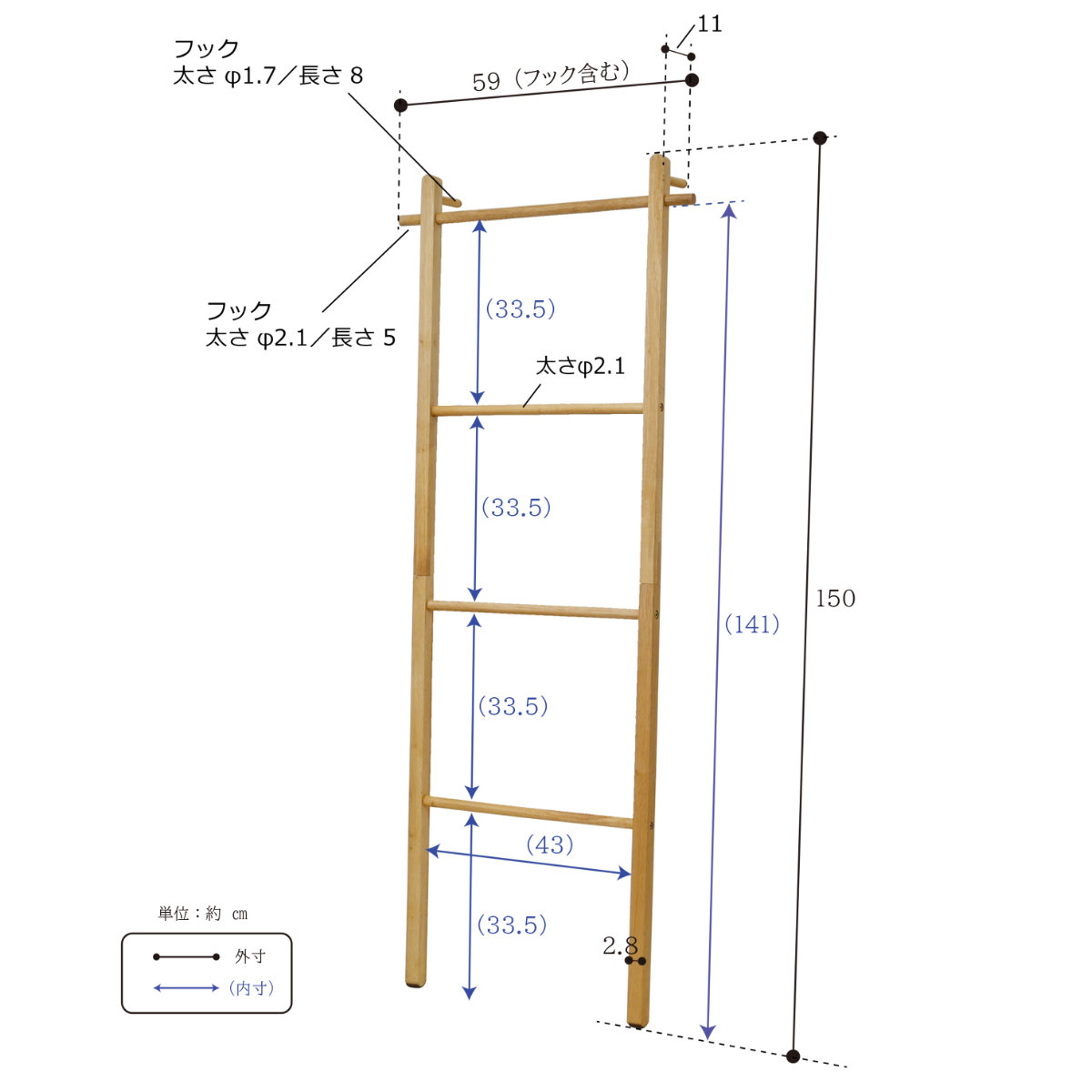 立て掛けるだけの天然木ラダーハンガー 幅59cm