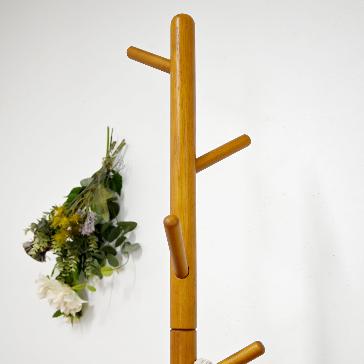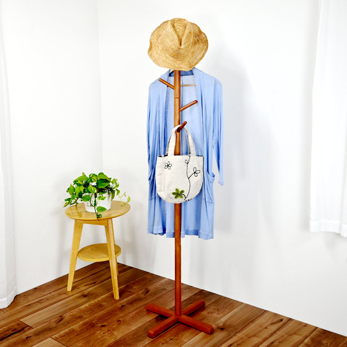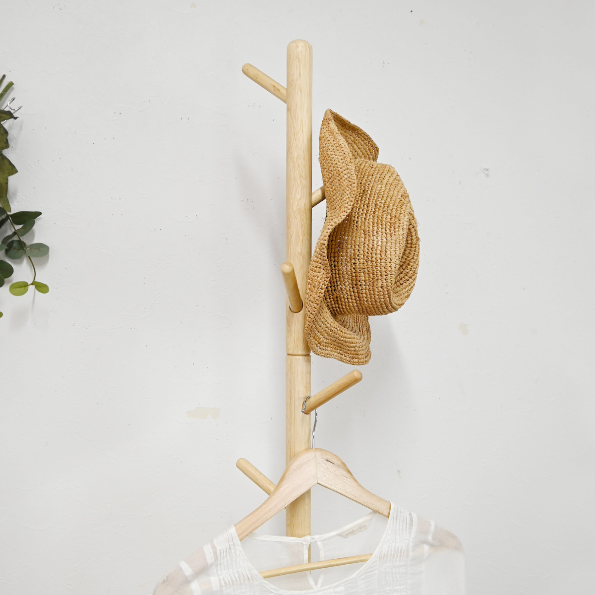 コート・バッグ・帽子などを掛けて収納できる、天然木ポールハンガーです。場所を取らないスリム設計で、玄関やお部屋をすっきり整えます。