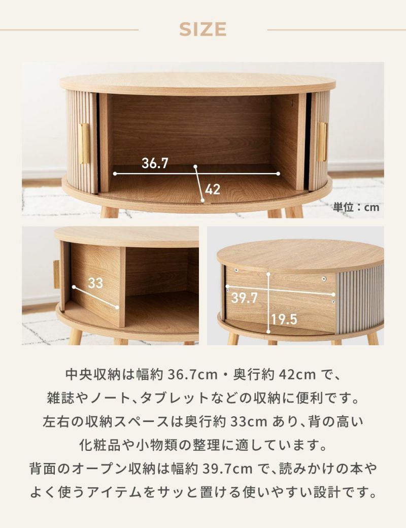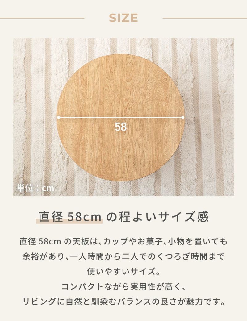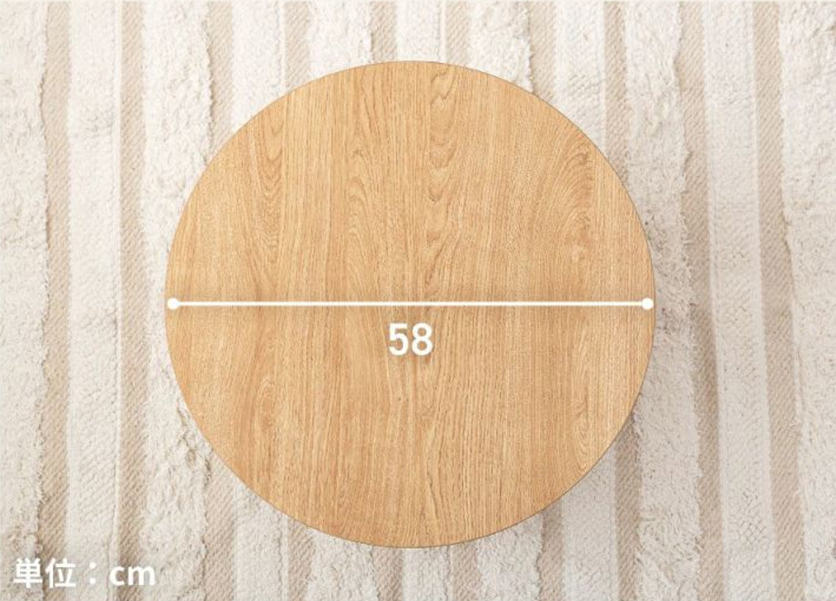 カップやお菓子、小物を置いても余裕があり、1人時間から2人でのくつろぎタイムまで使いやすいサイズです。コンパクトながら実用性が高く、リビングに自然となじみます。