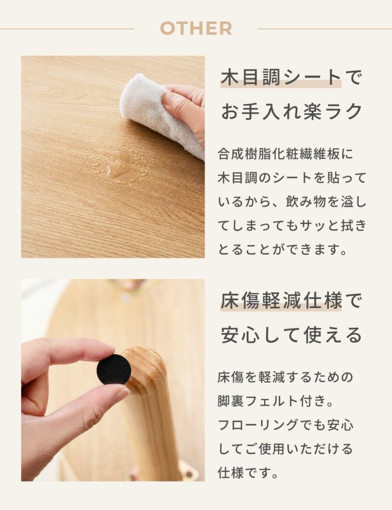 天板は木目調に仕上げ、脚部には天然木を使用しています。やさしいフォルムと温かみのある素材感が、北欧・ナチュラル・韓国インテリアなど幅広いテイストのお部屋になじみます。