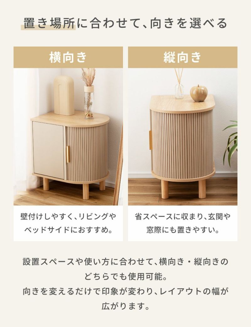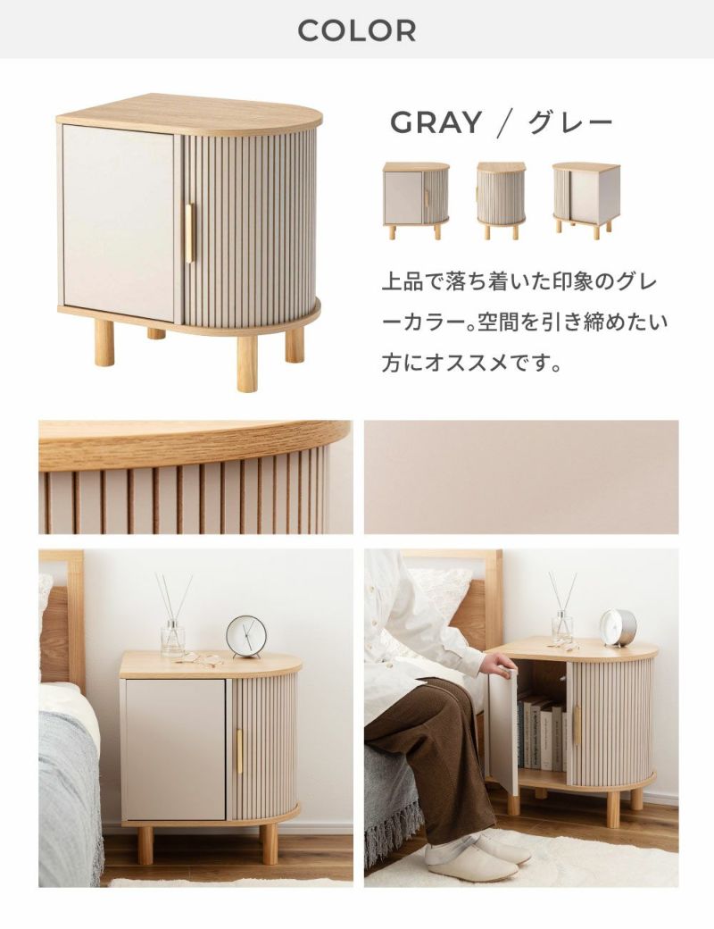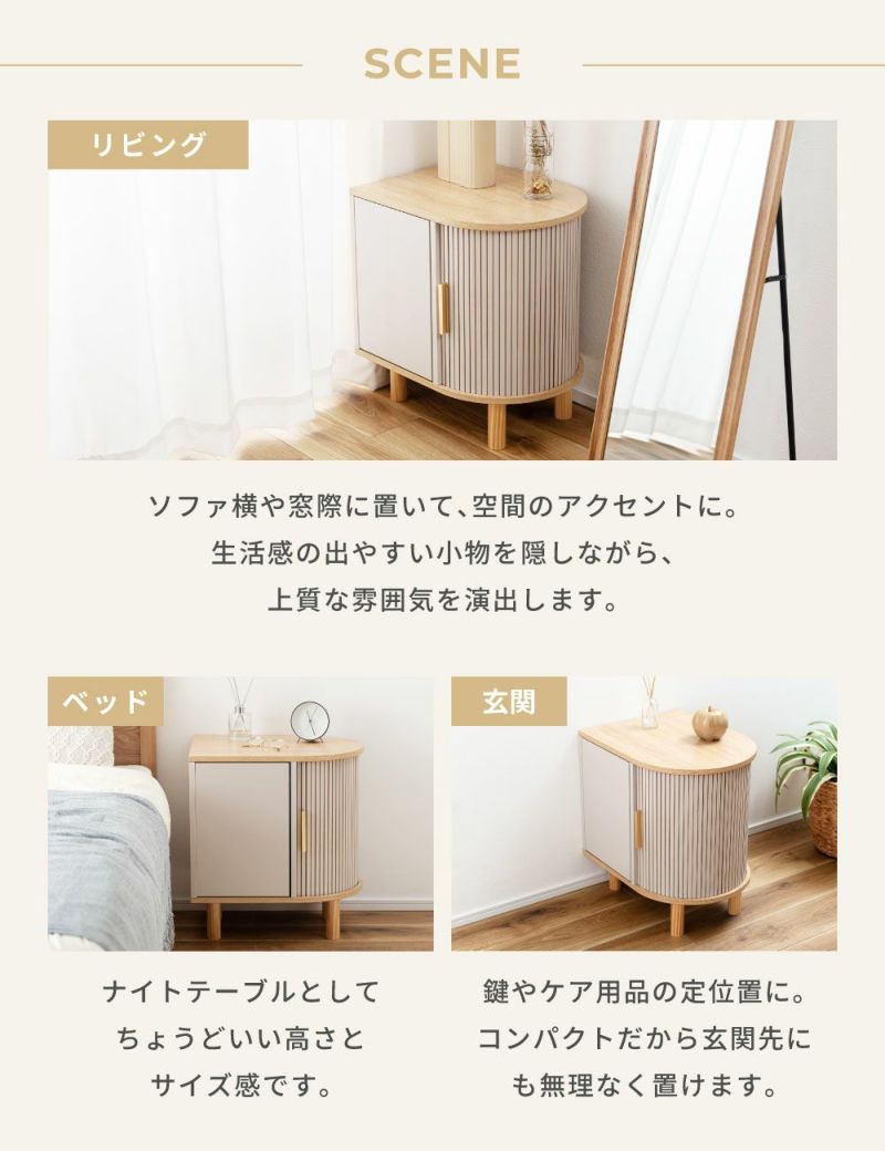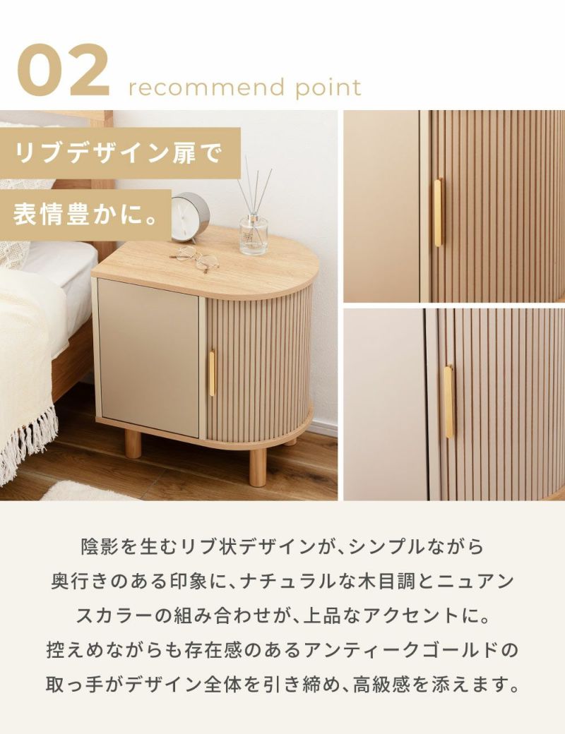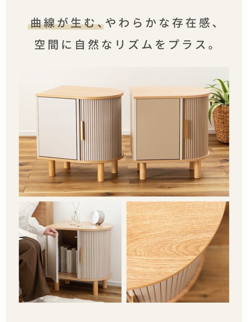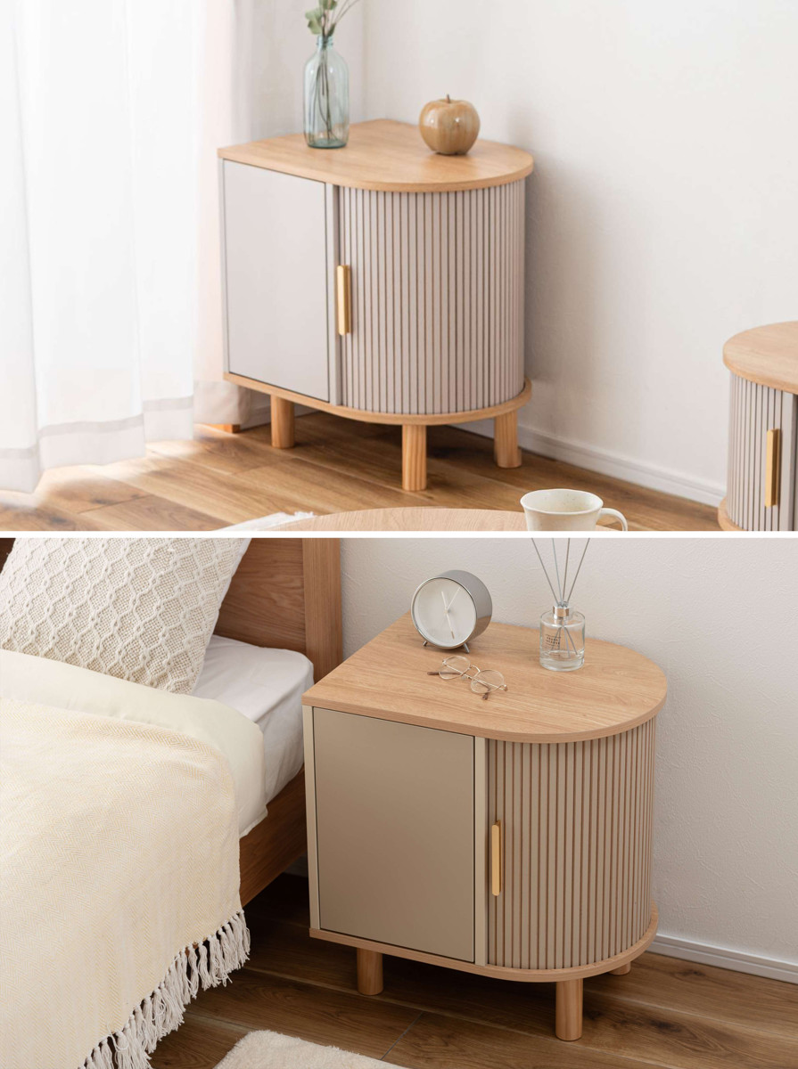 優雅なカーブを描くシルエットに表情豊かなリブデザイン扉を組み合わせた、個性的なデザインのキャビネットです。リビングのサイド収納としてはもちろん、ベッド横のナイトテーブルとしてもおすすめです。