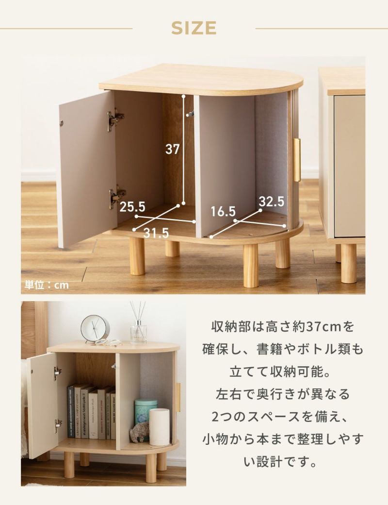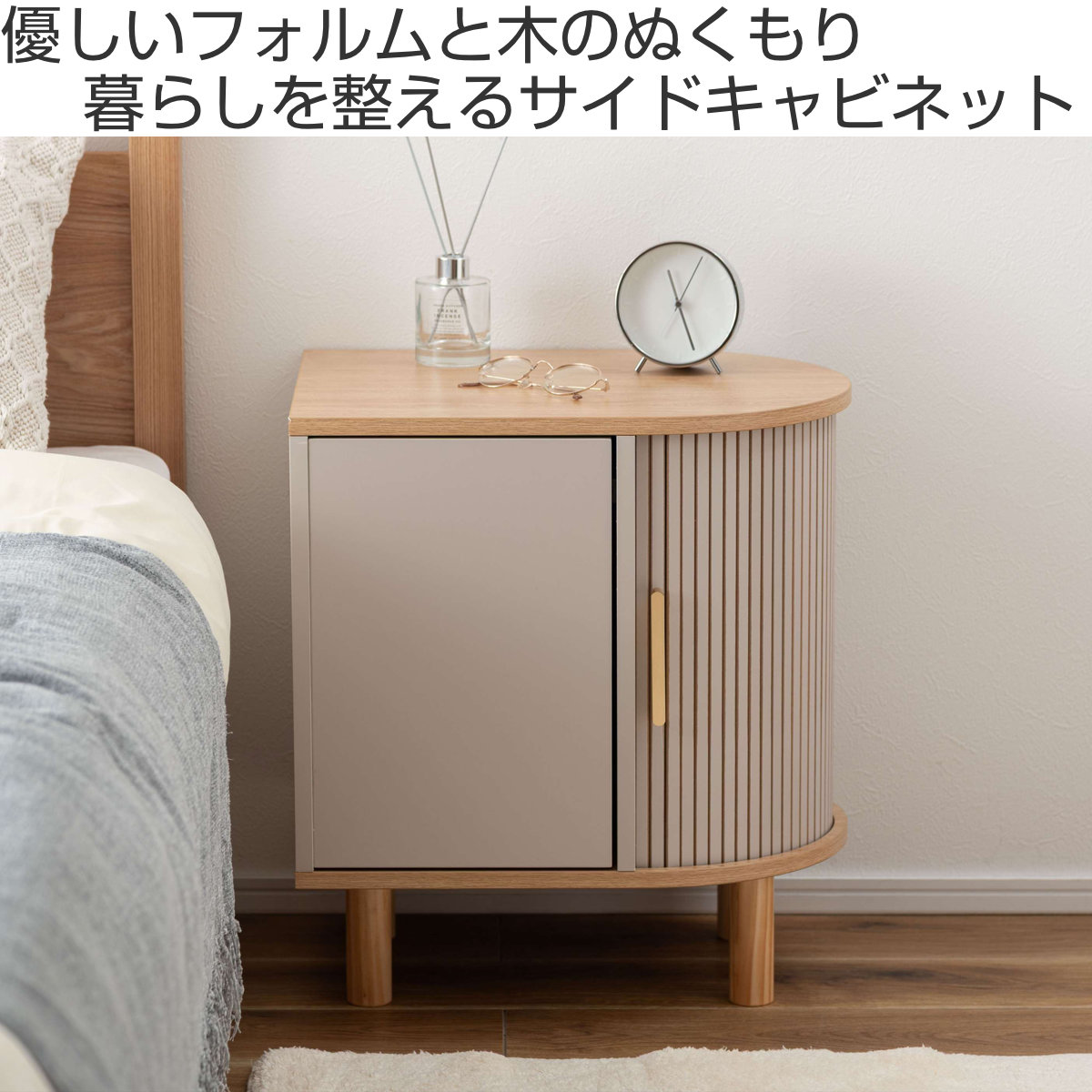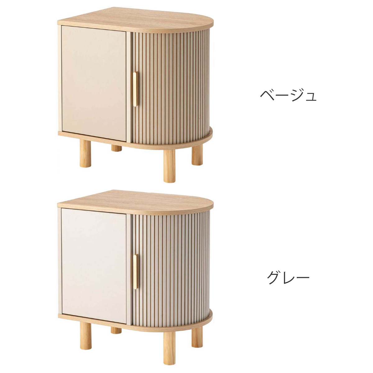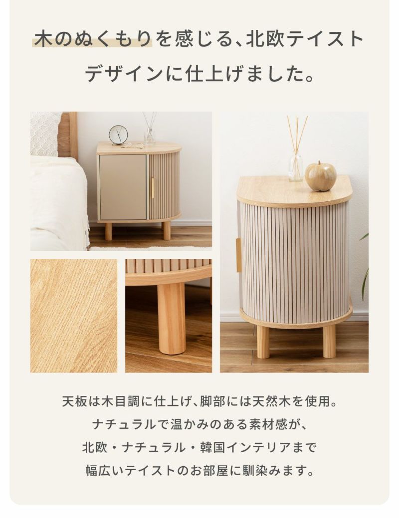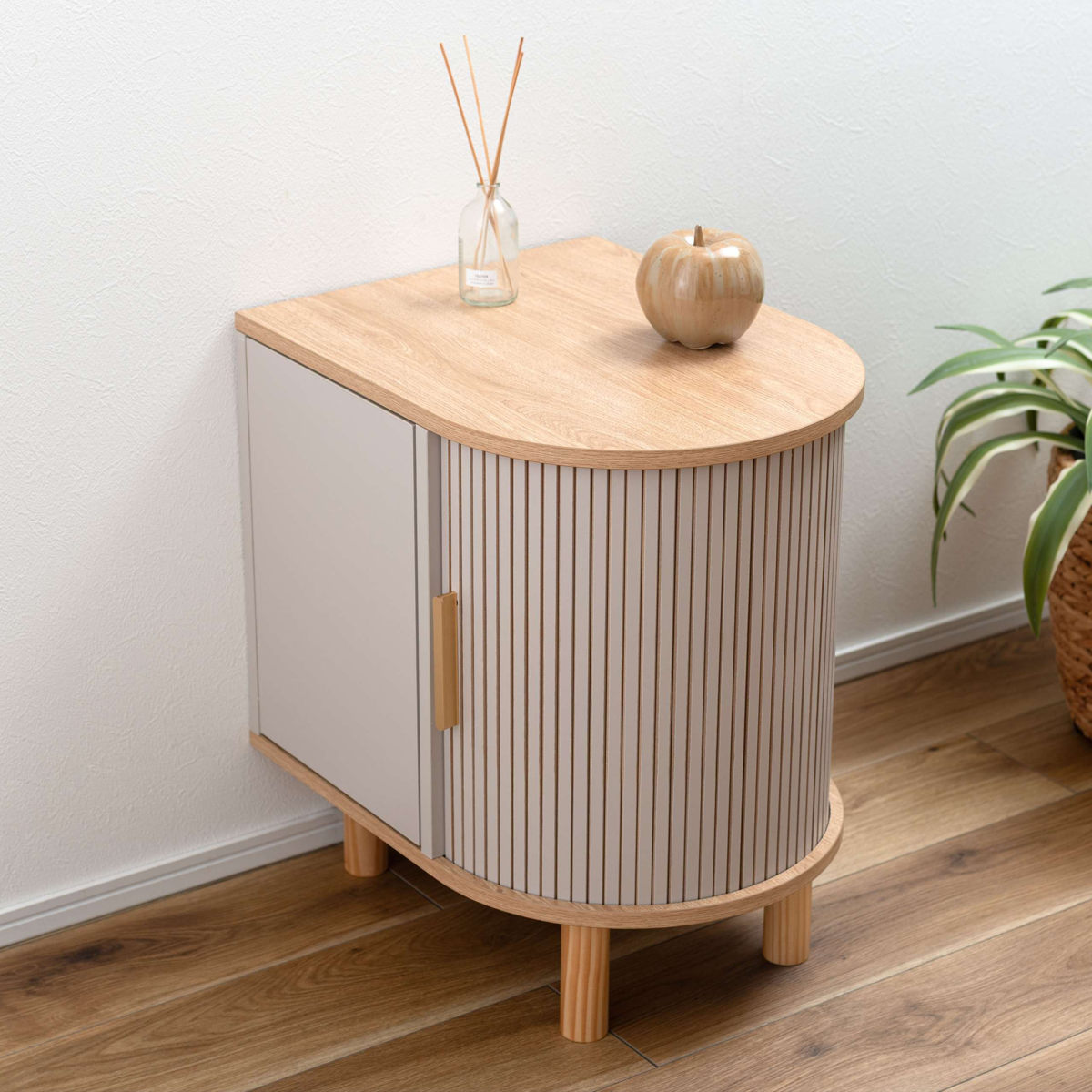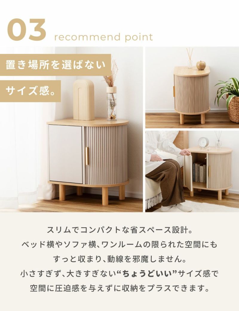 優雅なカーブを描くシルエットに表情豊かなリブデザイン扉を組み合わせた、個性的なデザインのキャビネットです。リビングのサイド収納としてはもちろん、ベッド横のナイトテーブルとしてもおすすめです。
