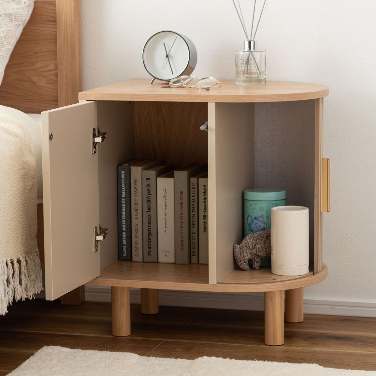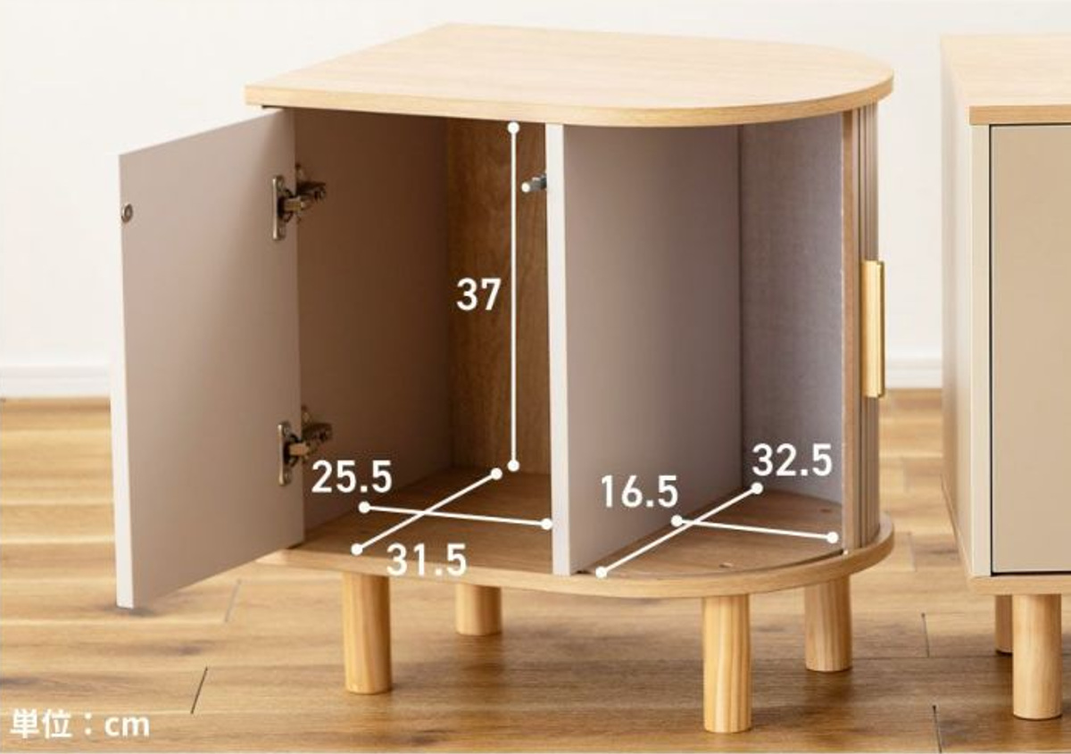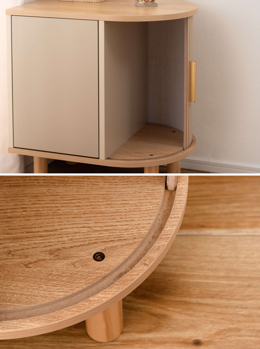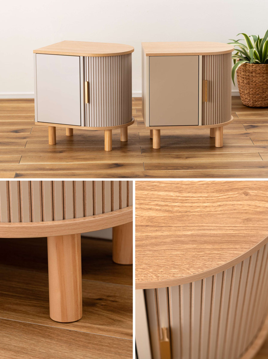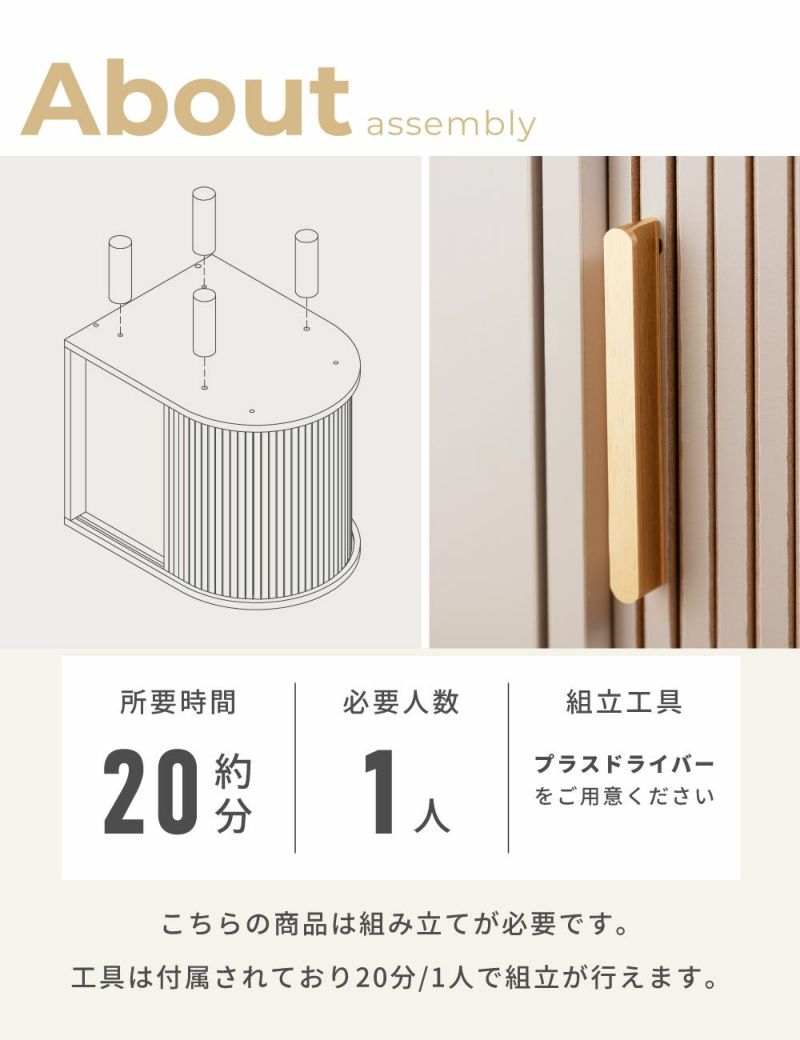 優雅なカーブを描くシルエットに表情豊かなリブデザイン扉を組み合わせた、個性的なデザインのキャビネットです。リビングのサイド収納としてはもちろん、ベッド横のナイトテーブルとしてもおすすめです。