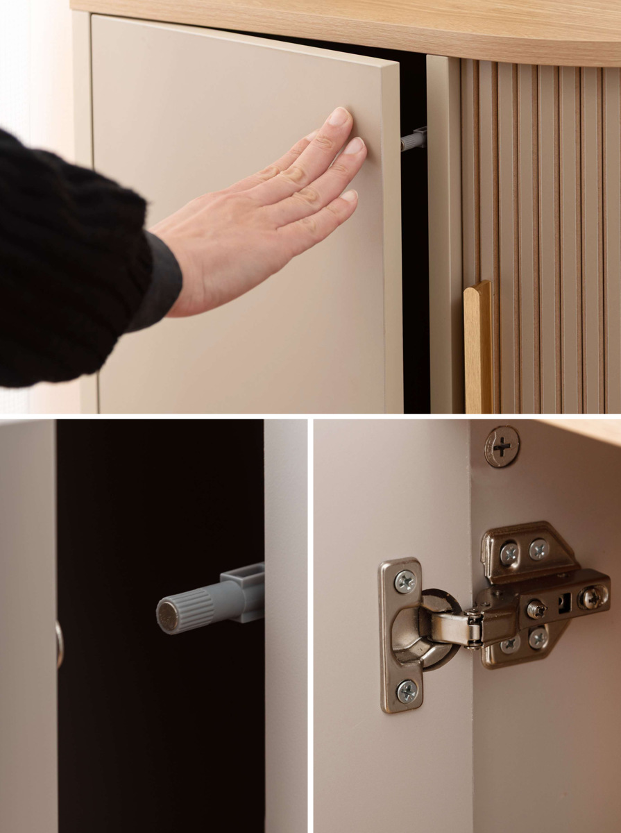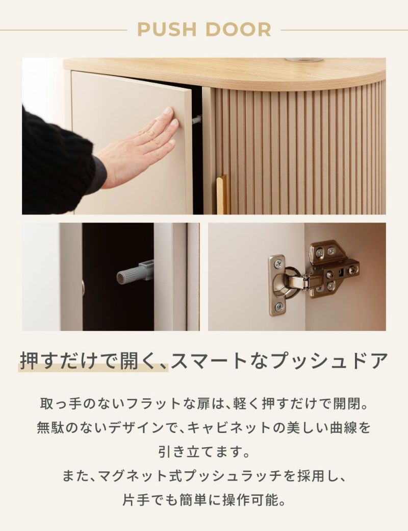 取っ手のないフラットな扉はマグネット式プッシュラッチを採用し、軽く押すだけで開閉できます。無駄のないデザインで、キャビネットの美しい曲線を引き立てます。