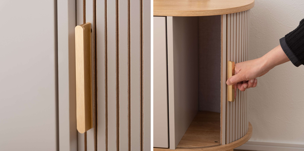 細身のゴールド調取っ手は、木目のやさしい風合いに上品なアクセントをプラスします。指をかけやすく開閉もしやすいため、毎日の使用も快適です。