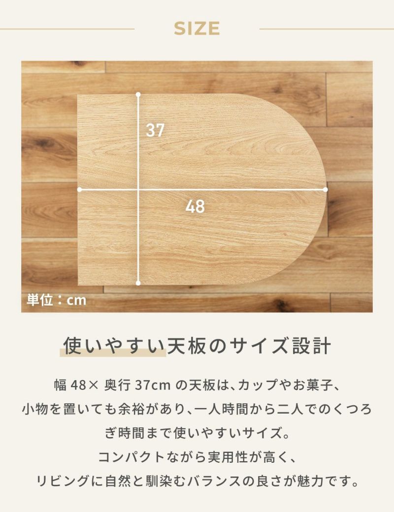 幅48×奥行37cmの天板は、カップやお菓子、小物を置いても余裕があり、一人時間から二人でのくつろぎ時間まで使いやすいサイズです。コンパクトながら実用性が高く、リビングに自然と馴染むバランスの良さが魅力です。