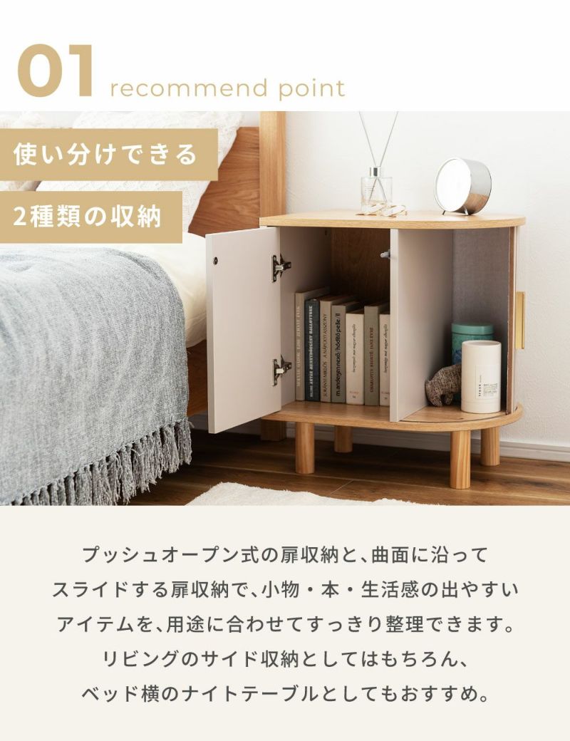 プッシュオープン式の扉収納と、曲面に沿ってスライドする扉収納で、小物・本・生活感の出やすいアイテムを用途に合わせてスッキリ収納できます。