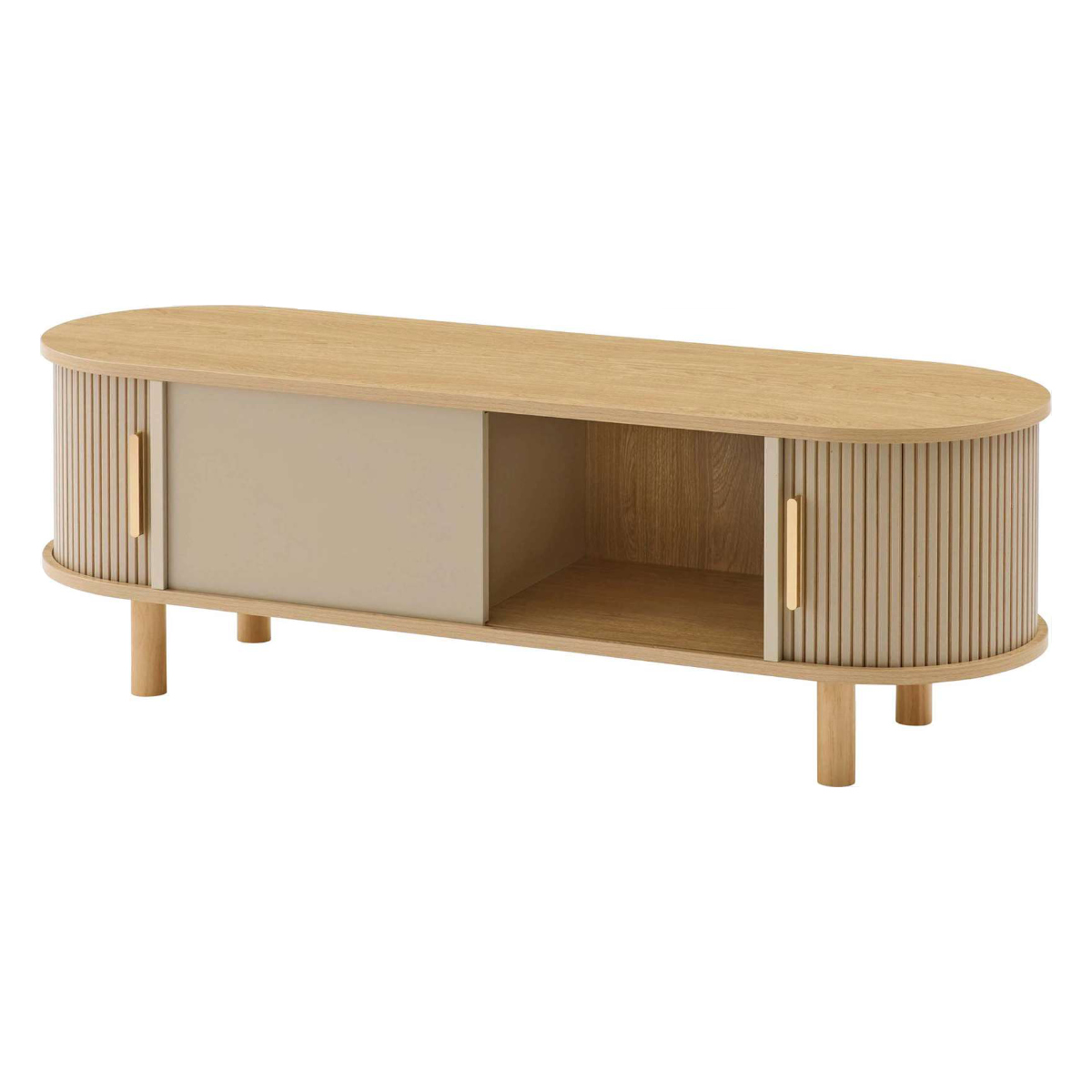 優雅なカーブを描くシルエットに表情豊かなリブデザイン扉を組み合わせた、個性的なデザインのローボードです。テレビ周りを整えつつ、お部屋に自然な華やかさをもたらしてくれます。