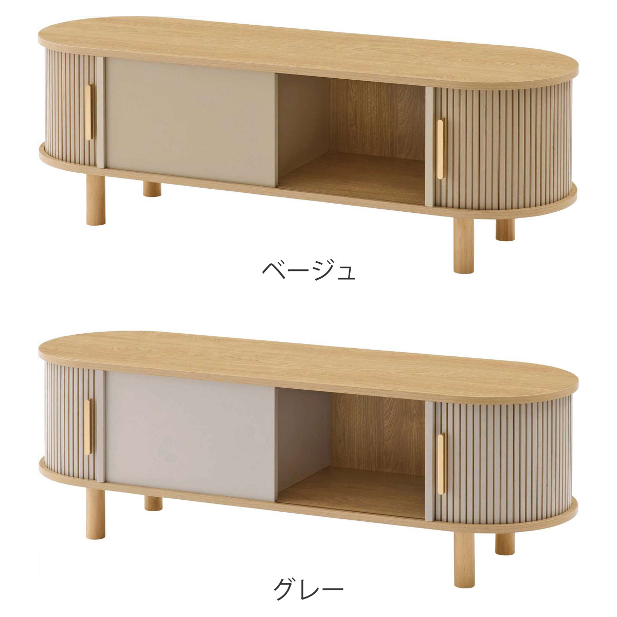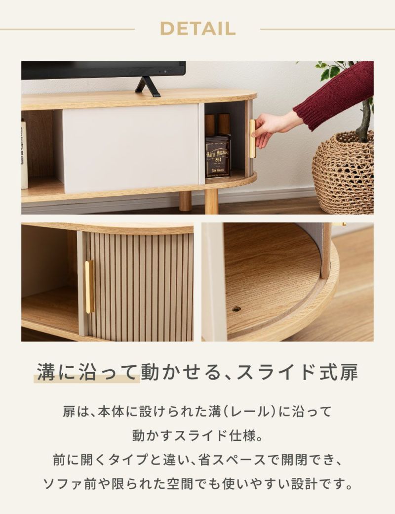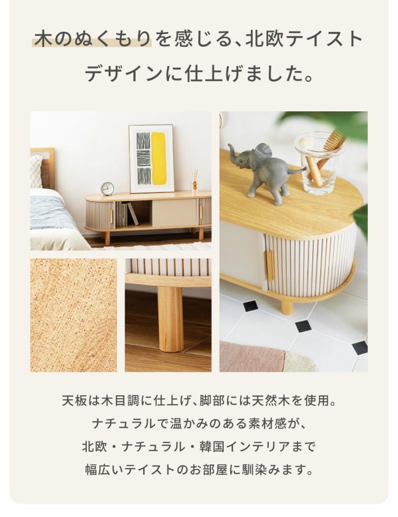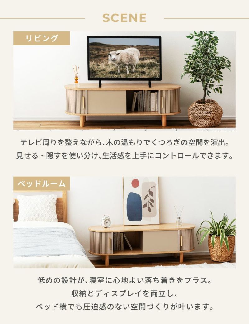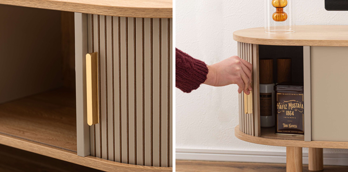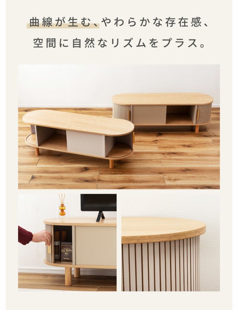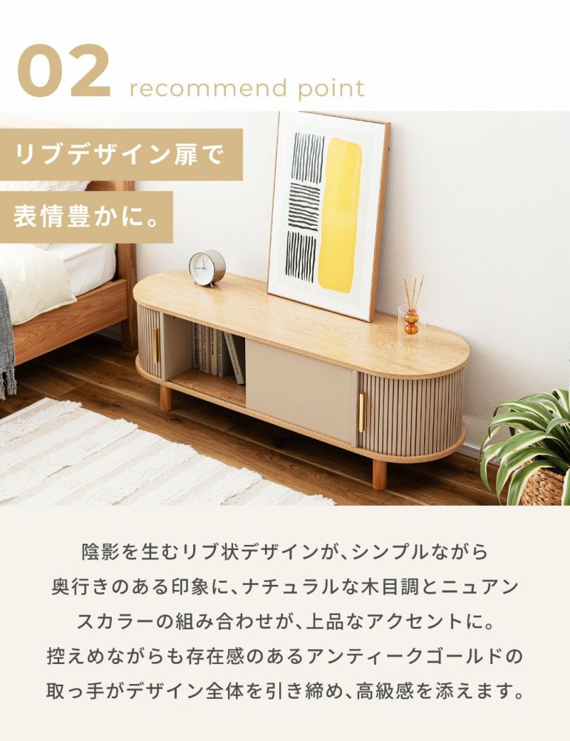優雅なカーブを描くシルエットに表情豊かなリブデザイン扉を組み合わせた、個性的なデザインのローボードです。テレビ周りを整えつつ、お部屋に自然な華やかさをもたらしてくれます。