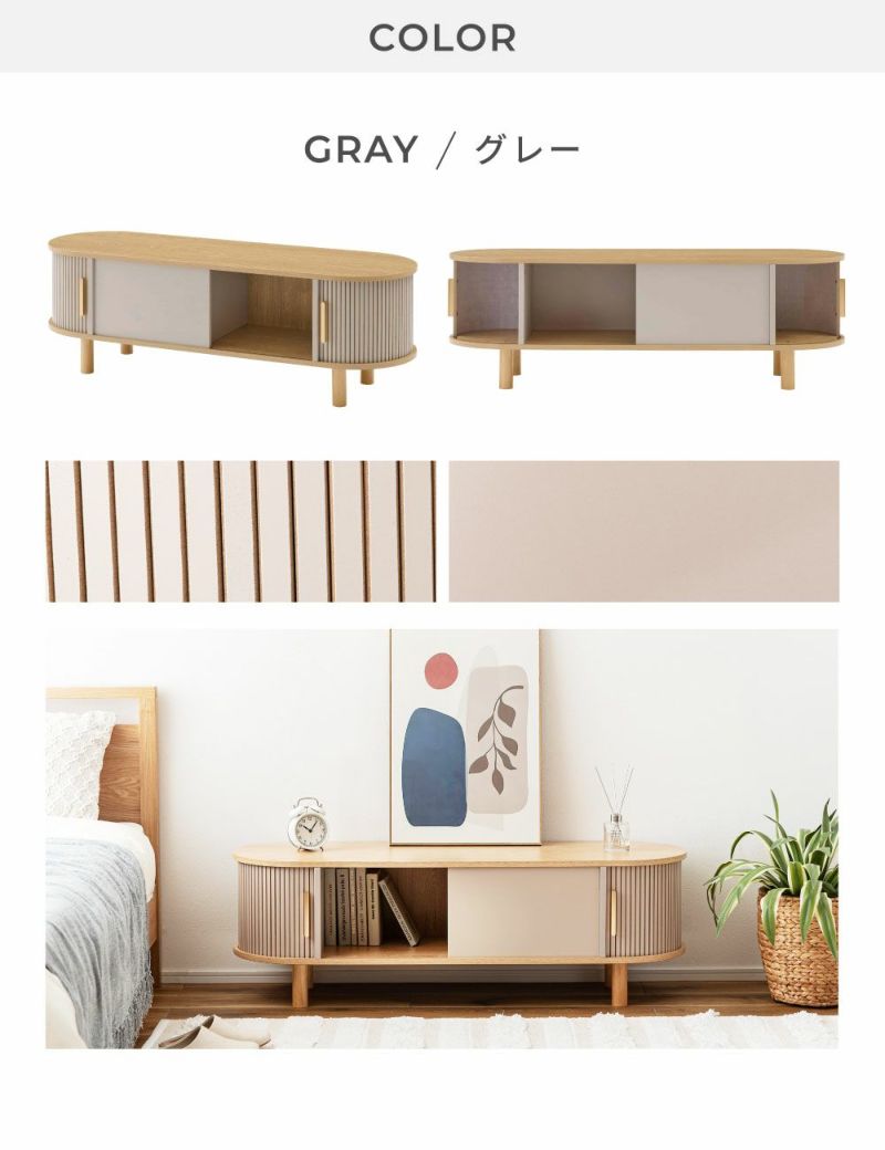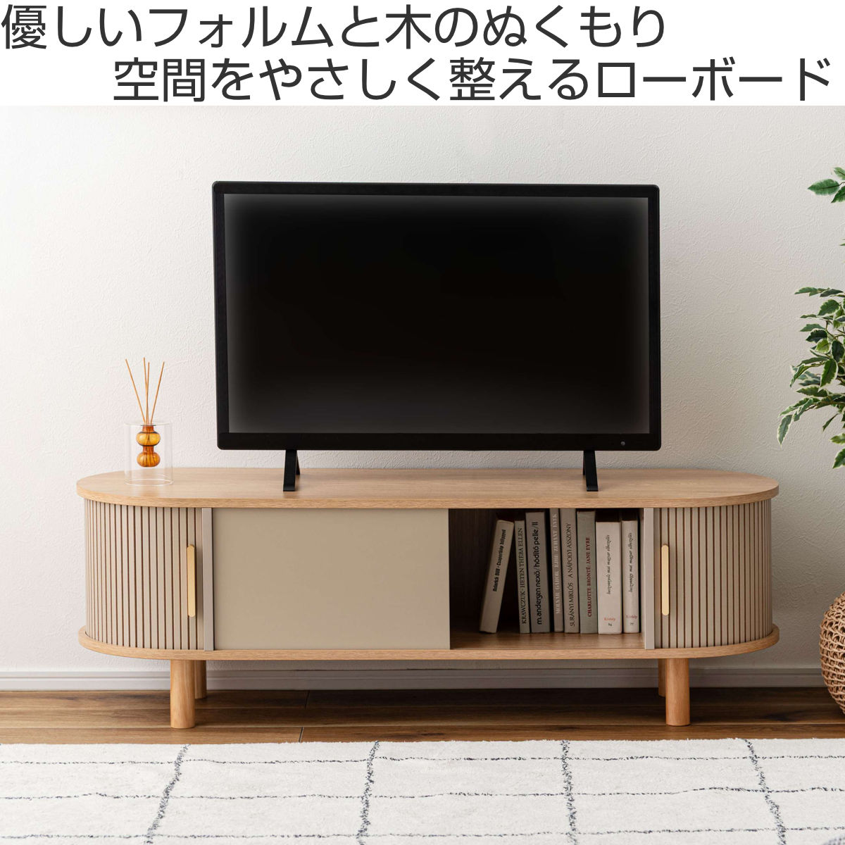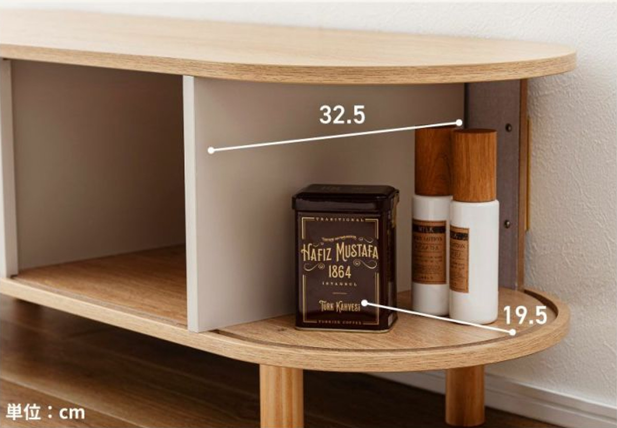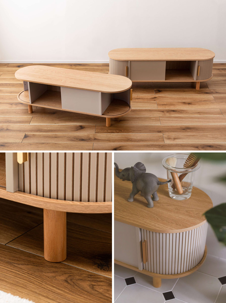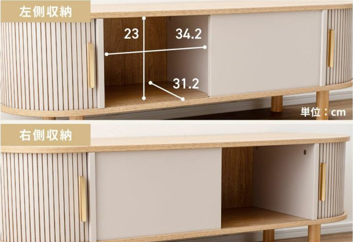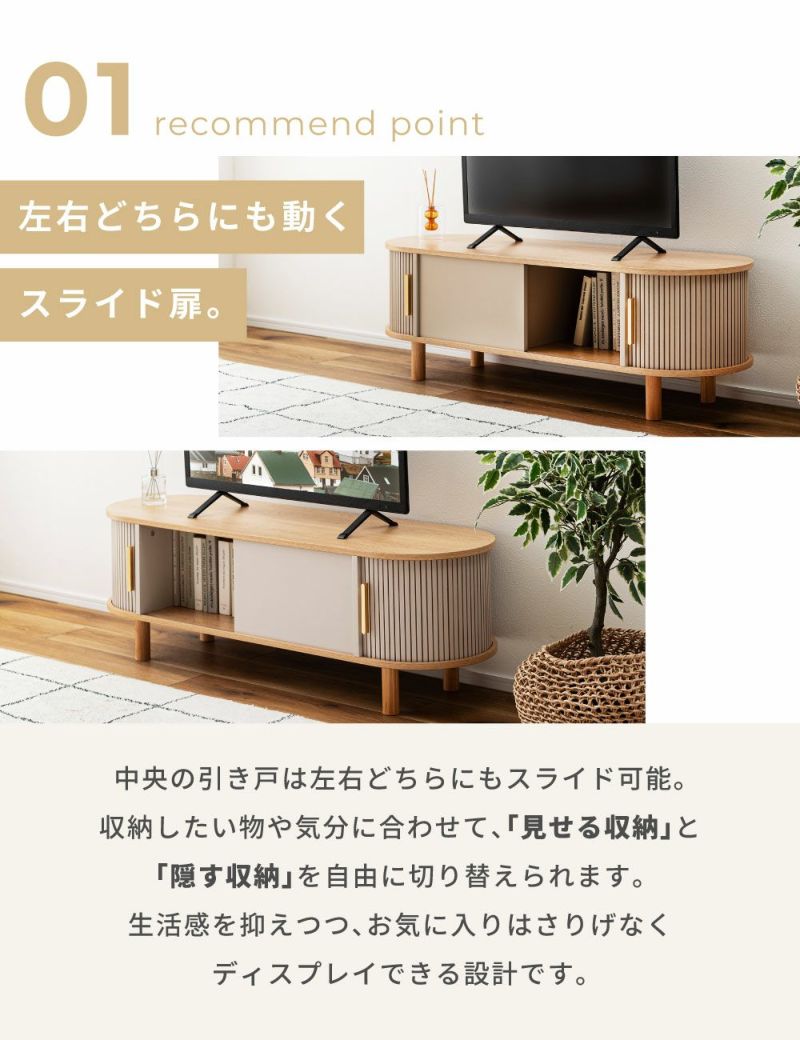 優雅なカーブを描くシルエットに表情豊かなリブデザイン扉を組み合わせた、個性的なデザインのローボードです。テレビ周りを整えつつ、お部屋に自然な華やかさをもたらしてくれます。