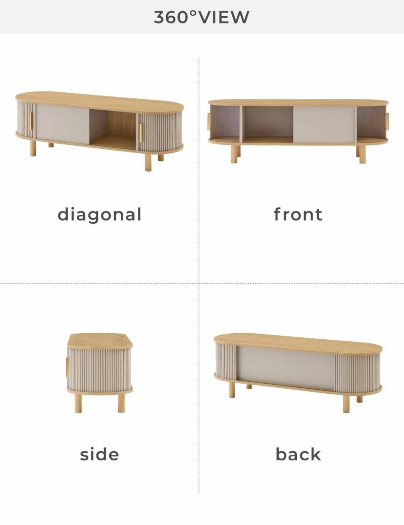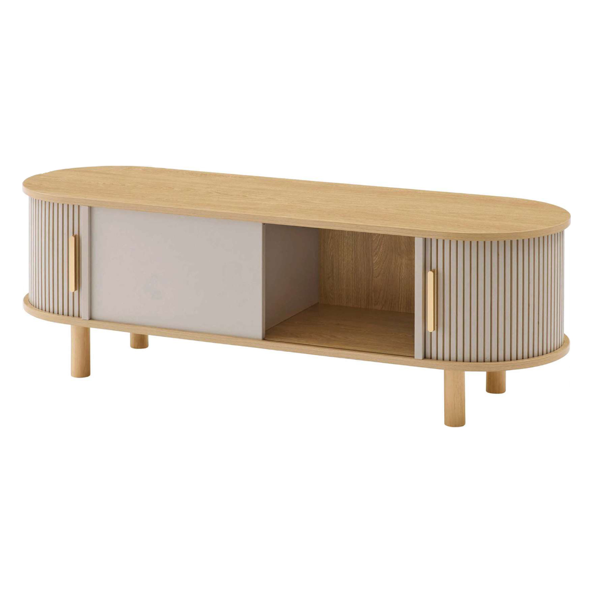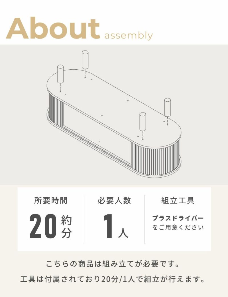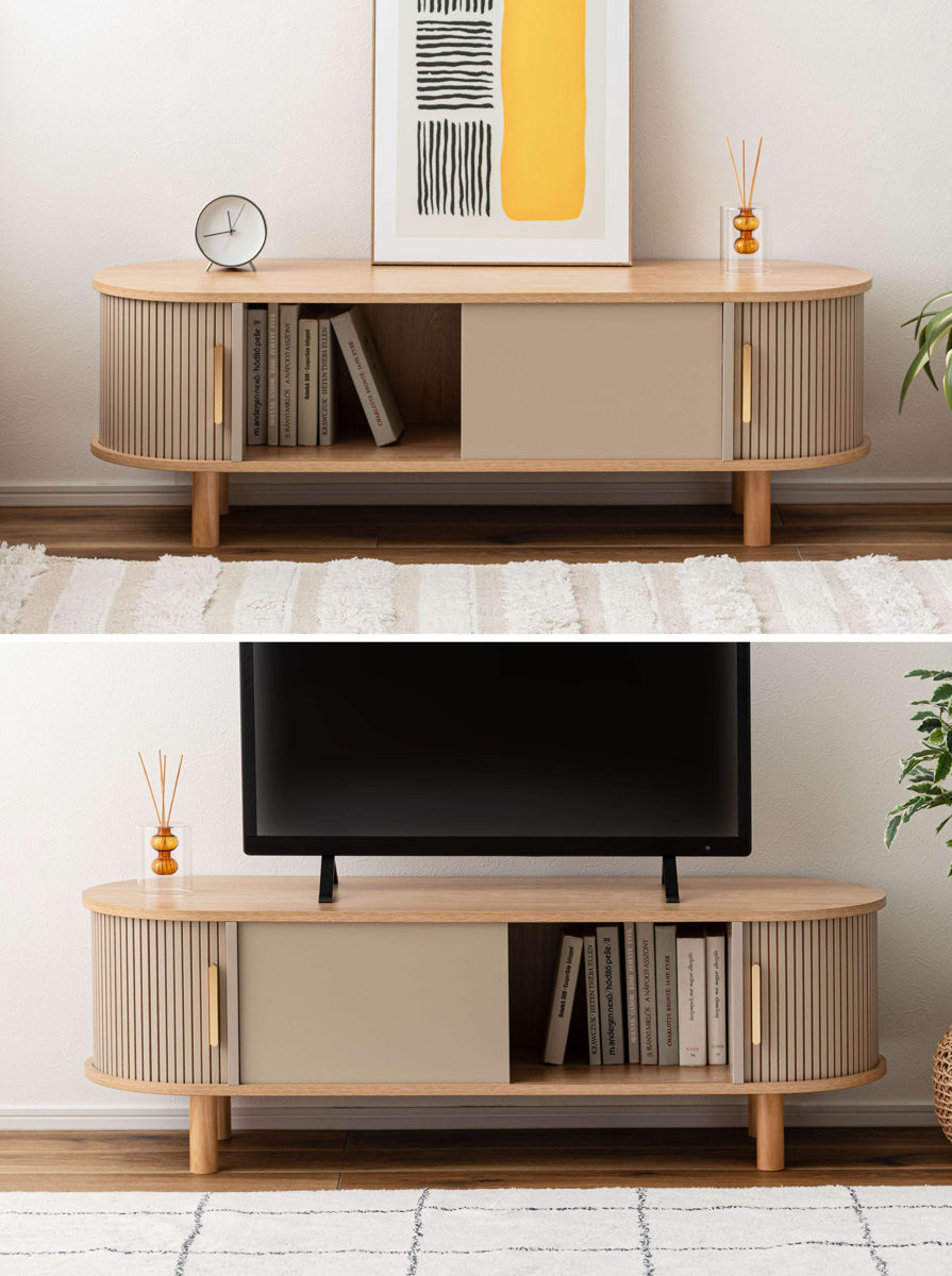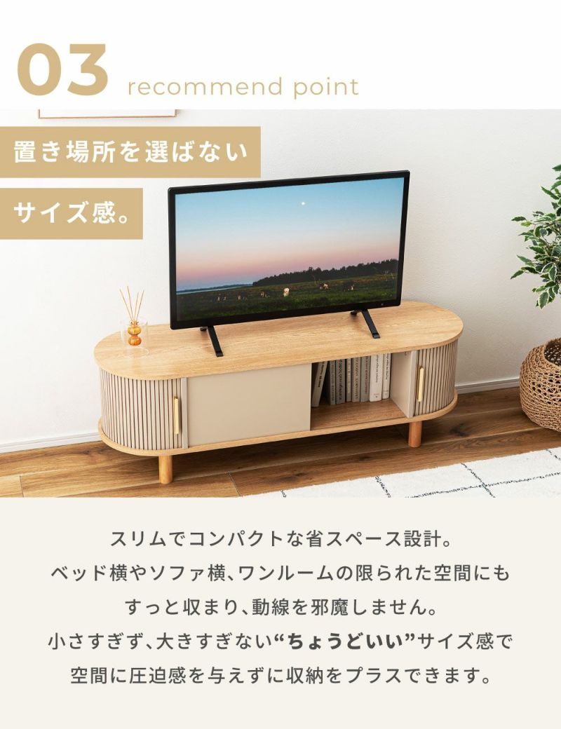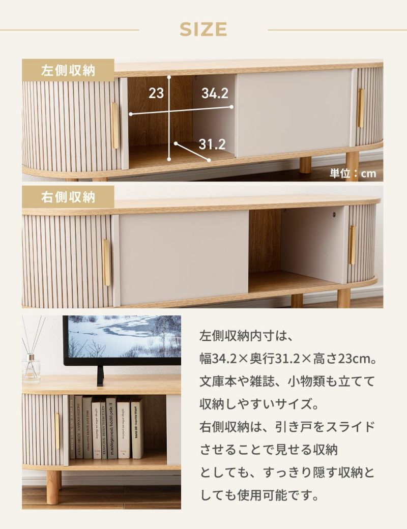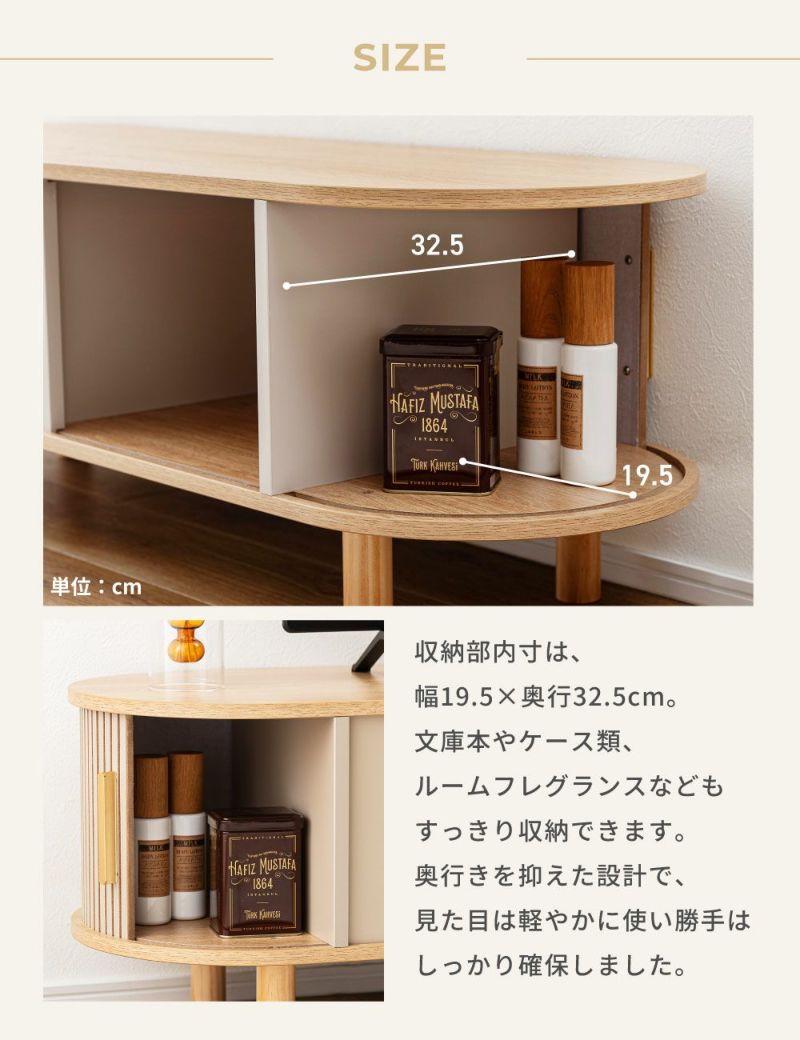 優雅なカーブを描くシルエットに表情豊かなリブデザイン扉を組み合わせた、個性的なデザインのローボードです。テレビ周りを整えつつ、お部屋に自然な華やかさをもたらしてくれます。