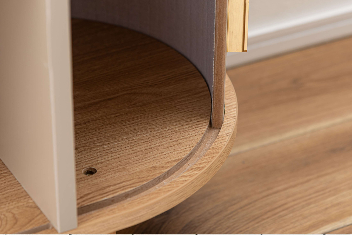 細身のゴールド調取っ手は、木目のやさしい風合いに上品なアクセントをプラスします。指をかけやすく開閉もしやすいため、毎日の使用も快適です。