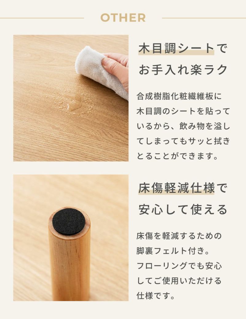 合成樹脂化粧繊維板に木目調のシートを貼っているため、飲み物をこぼしてしまってもサッと拭き取ることができます。