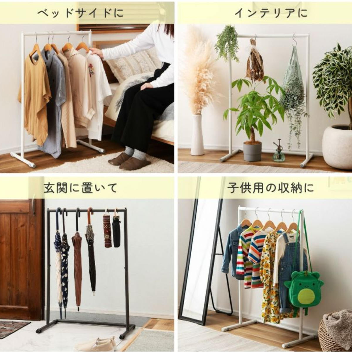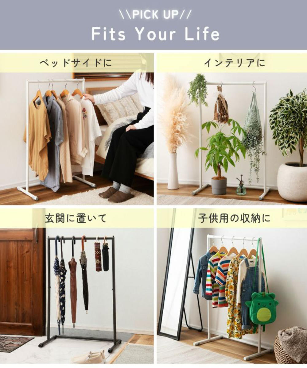 ベッドサイドや玄関、リビングなどさまざまな場所で活躍。 衣類収納はもちろん、観葉植物や傘、お子さまの上着やバッグ置きとしても便利です。