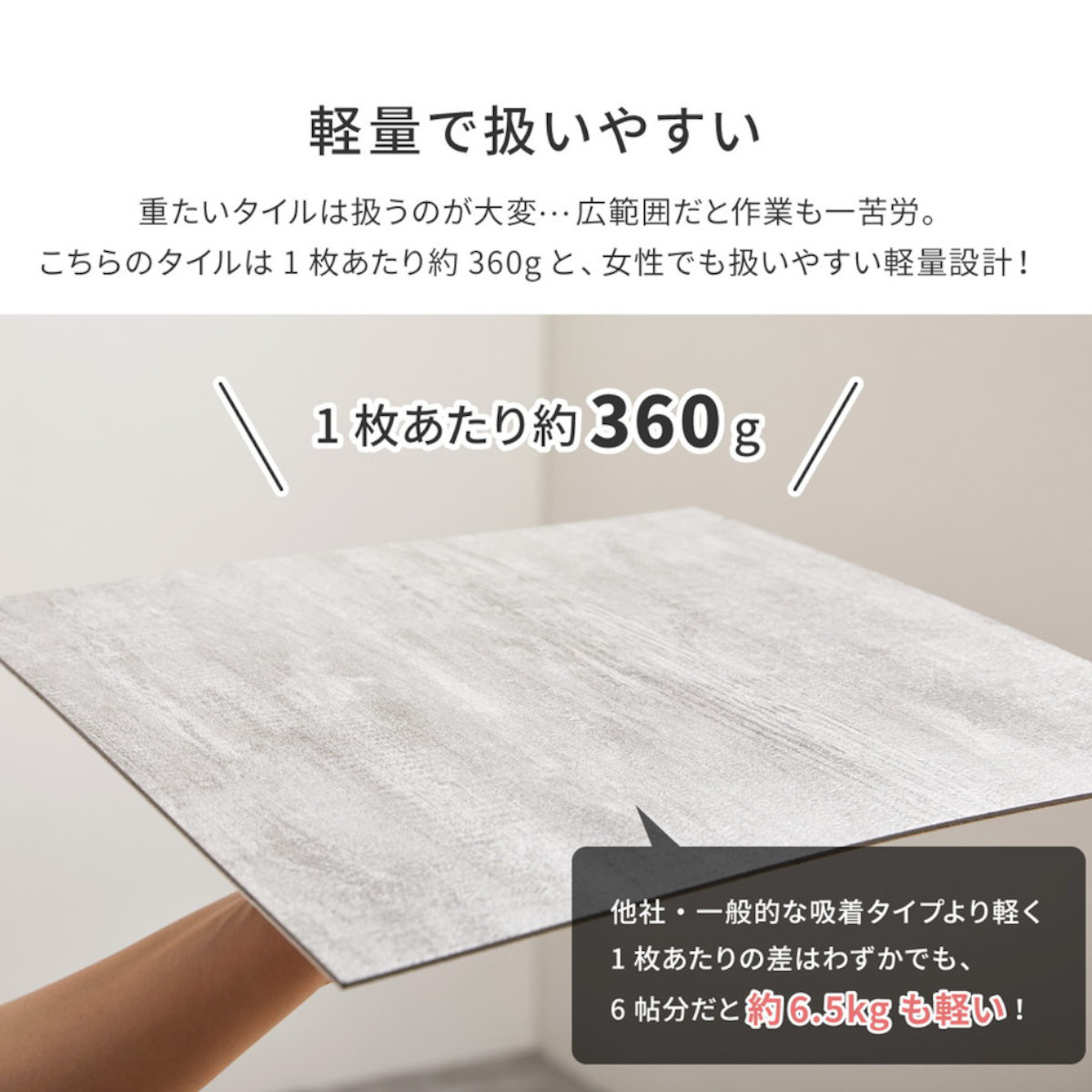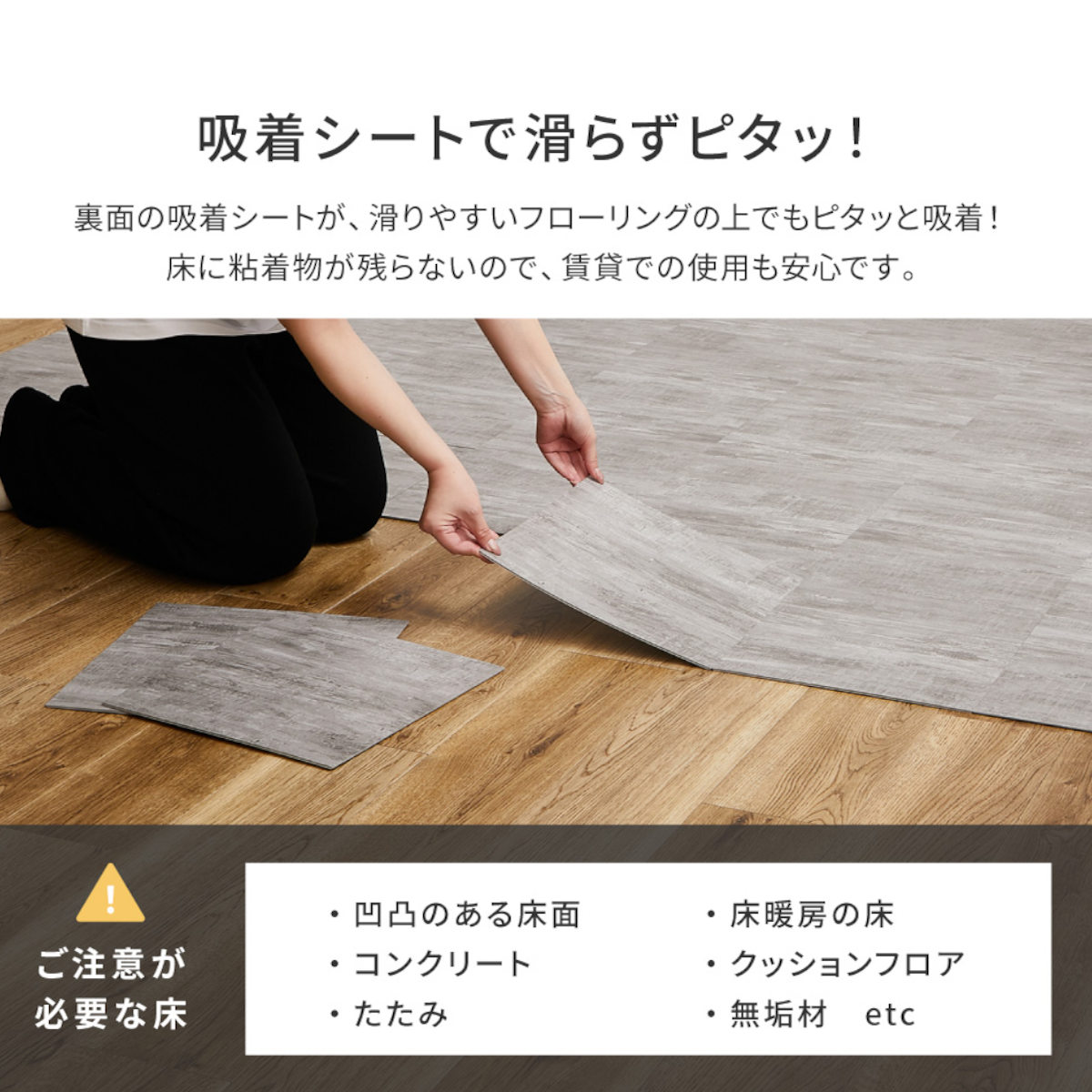 貼ってはがせて、何度も繰り返し使えるフロアタイルです。裏面の吸着シートが、すべりやすいフローリングの上でもピタッと吸着します。床に粘着物が残らないので、賃貸住宅でも安心してご使用いただけます。