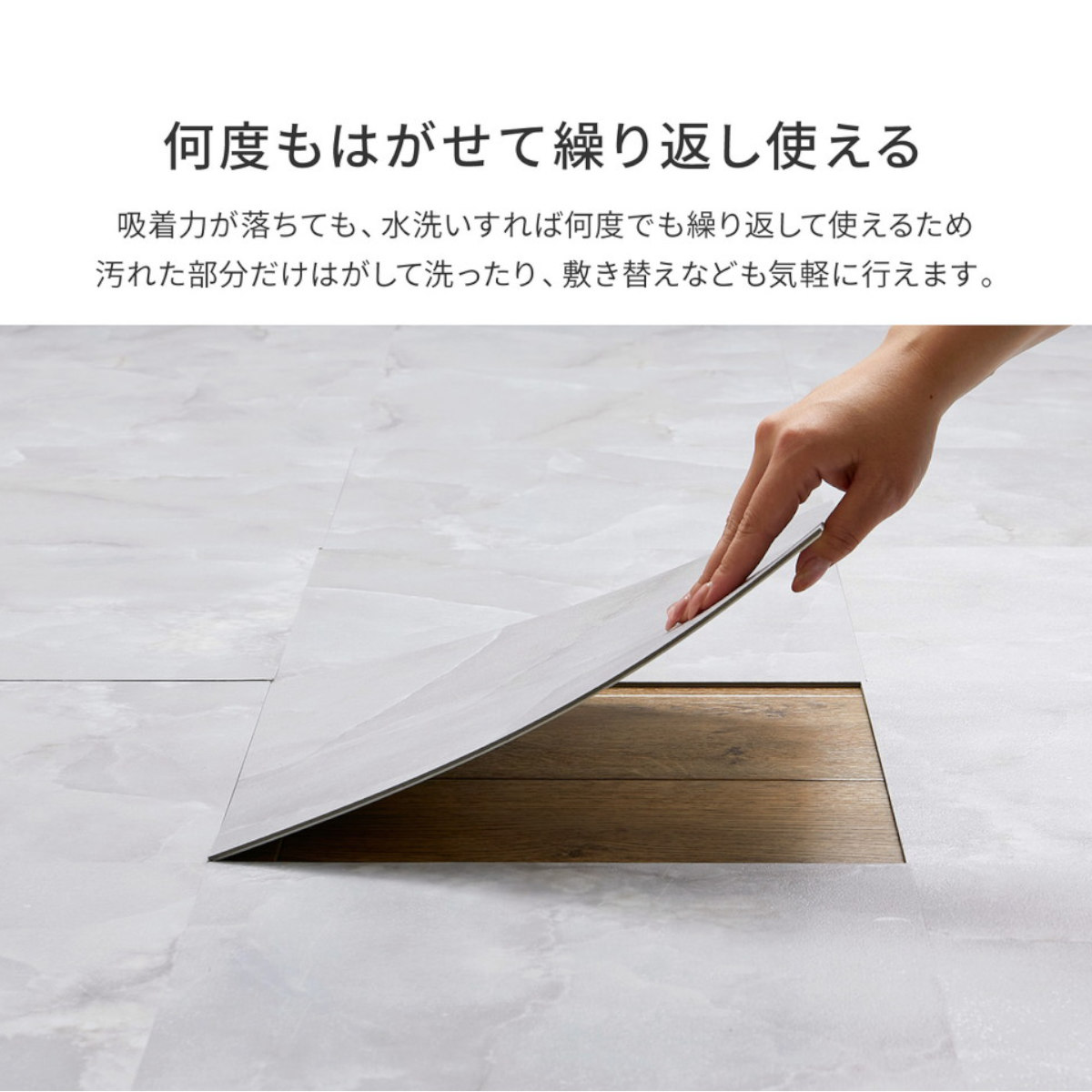 吸着力が落ちても、水洗いをすると粘着力が戻るので、何度でも繰り返してご使用いただけます。汚れた部分だけ剥がして洗ったり、敷き替えなども気軽に行えます。簡単にお部屋をイメージチェンジできる便利なアイテムです。