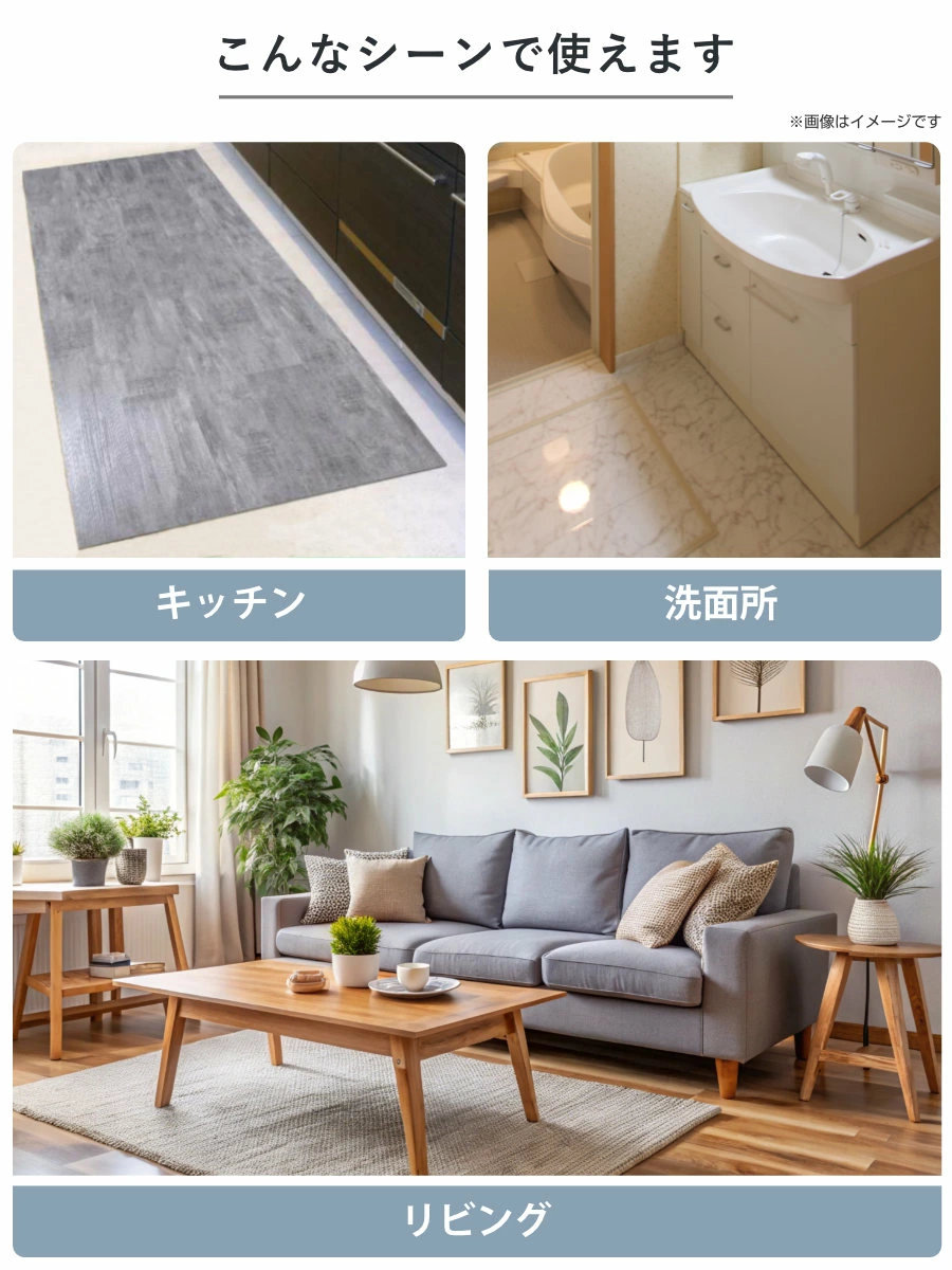 貼ってはがせて、何度も繰り返し使えるフロアタイルです。裏面の吸着シートが、すべりやすいフローリングの上でもピタッと吸着します。床に粘着物が残らないので、賃貸住宅でも安心してご使用いただけます。