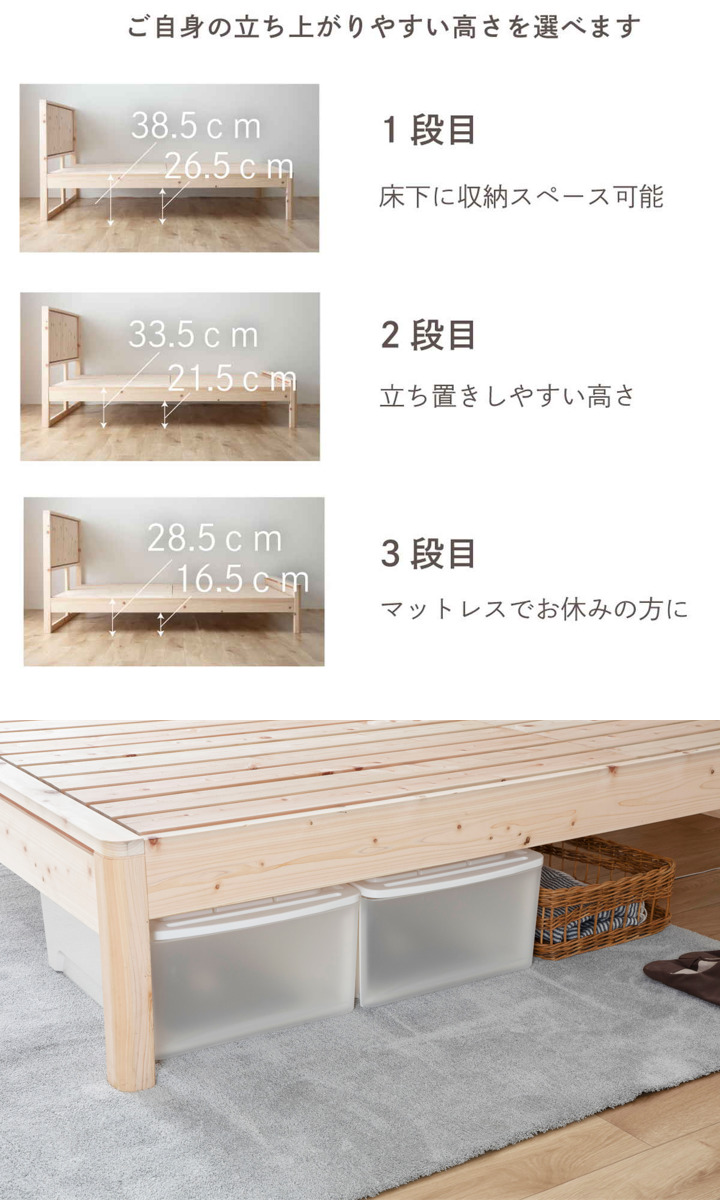 3段階の高さ調整が可能で、ロータイプとしても使用できます。圧迫感を抑えてお部屋を広く見せながら、高さを上げればベッド下を収納スペースとして活用できます。暮らしに合わせて自由に使い分けられます。