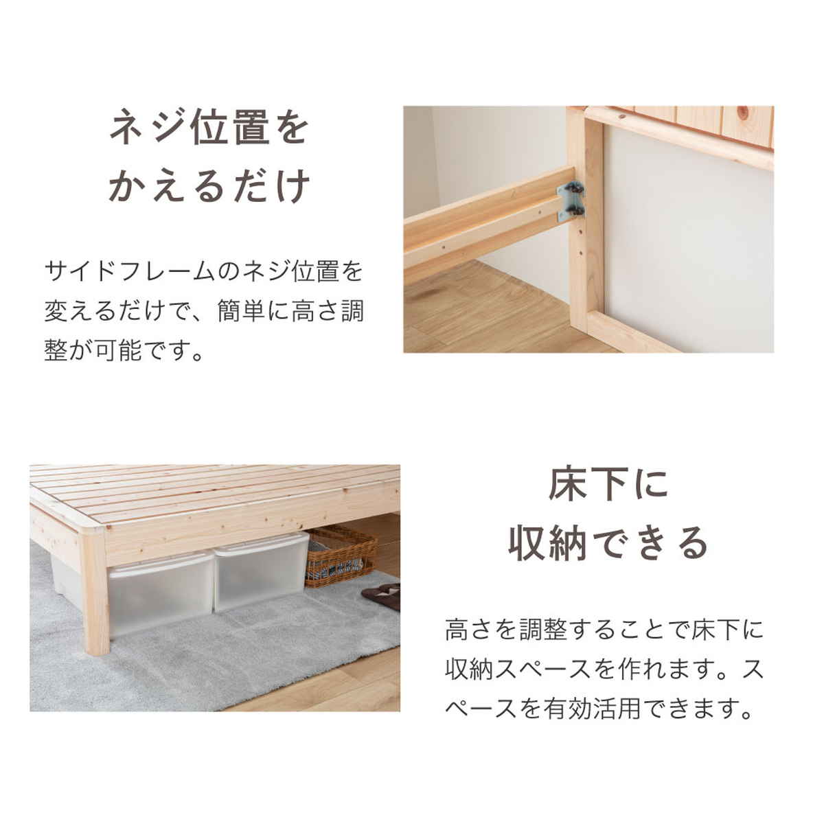 3段階の高さ調整が可能で、ロータイプとしても使用できます。圧迫感を抑えてお部屋を広く見せながら、高さを上げればベッド下を収納スペースとして活用できます。暮らしに合わせて自由に使い分けられます。