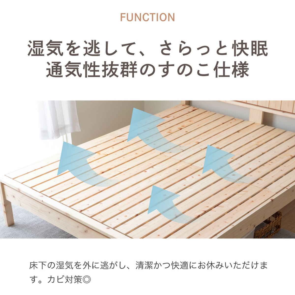 床板は通気性に優れたすのこ仕様です。湿気を逃がし、カビやムレを防ぎながら快適な寝環境を保ちます。