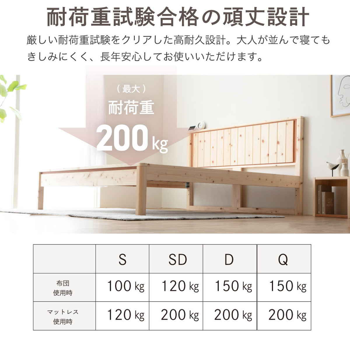 | 耐荷重 | マットレス使用時:200kg 布団使用時:150kg |