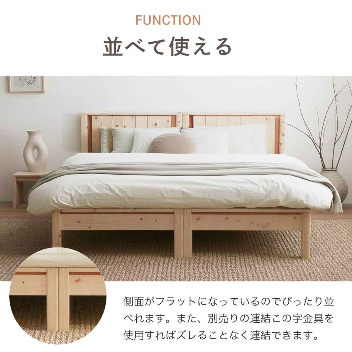 ひのき特有のやさしい香りが広がり、まるで森林浴のようなリラックス空間を演出できるベッドフレームです。毎日の眠りを、より心地よい時間へと導きます。