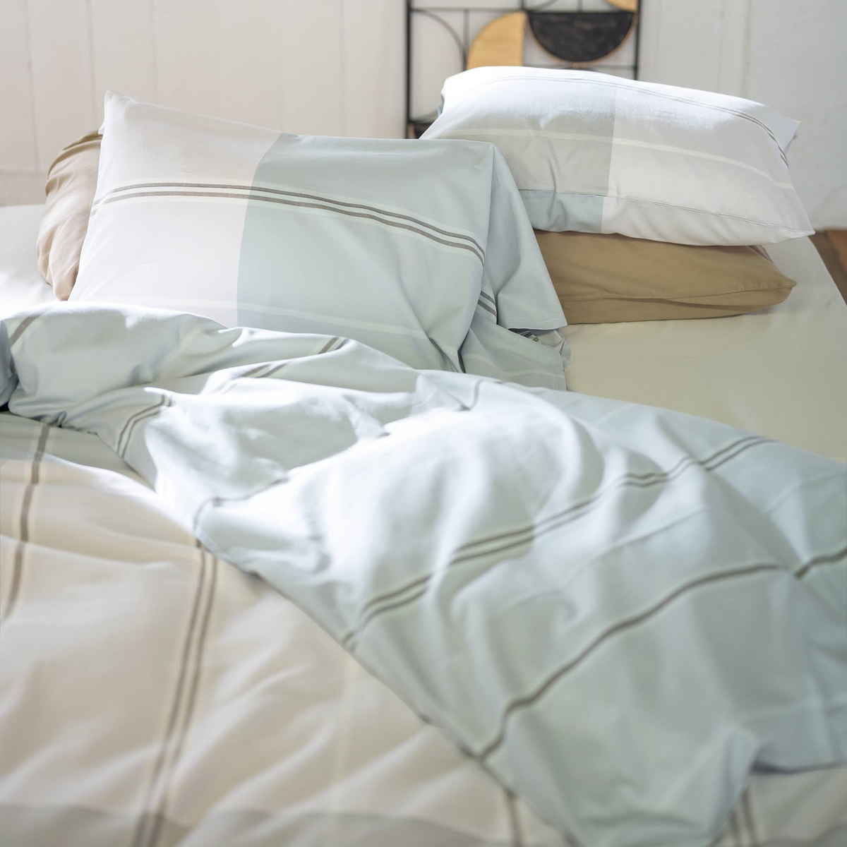 同じヴィスタシリーズで揃えることで、統一感のある落ち着いた寝室を演出できます。やさしい色合いのボーダーデザインが空間に心地よいアクセントを添え、穏やかな雰囲気の寝室づくりにおすすめです。