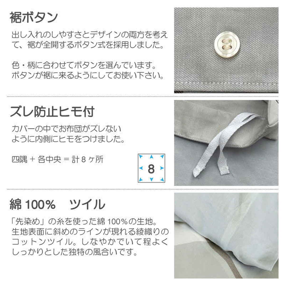 カバーの内側には布団がずれにくいよう、ズレ防止ヒモを付けています。四隅と中央の計8ヶ所でしっかり固定できます。