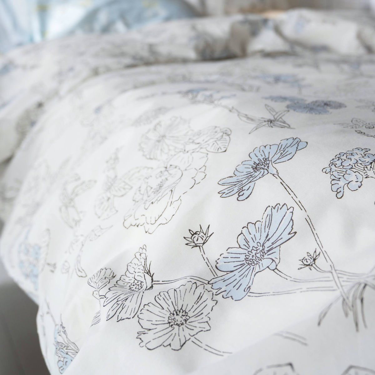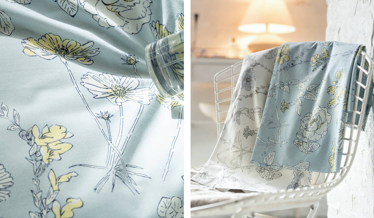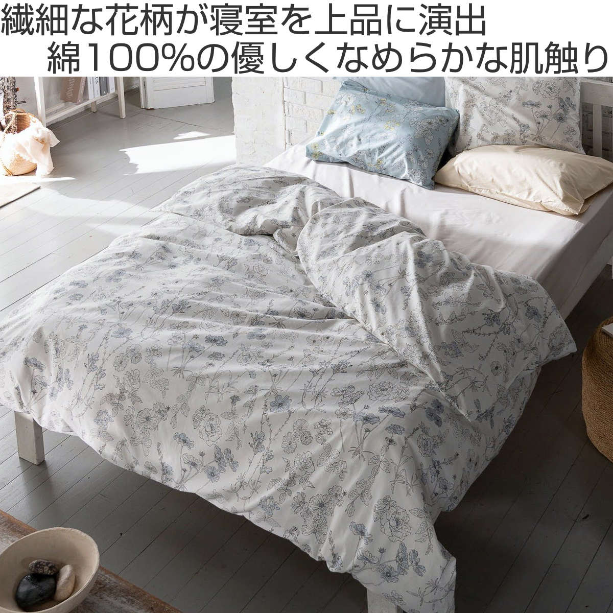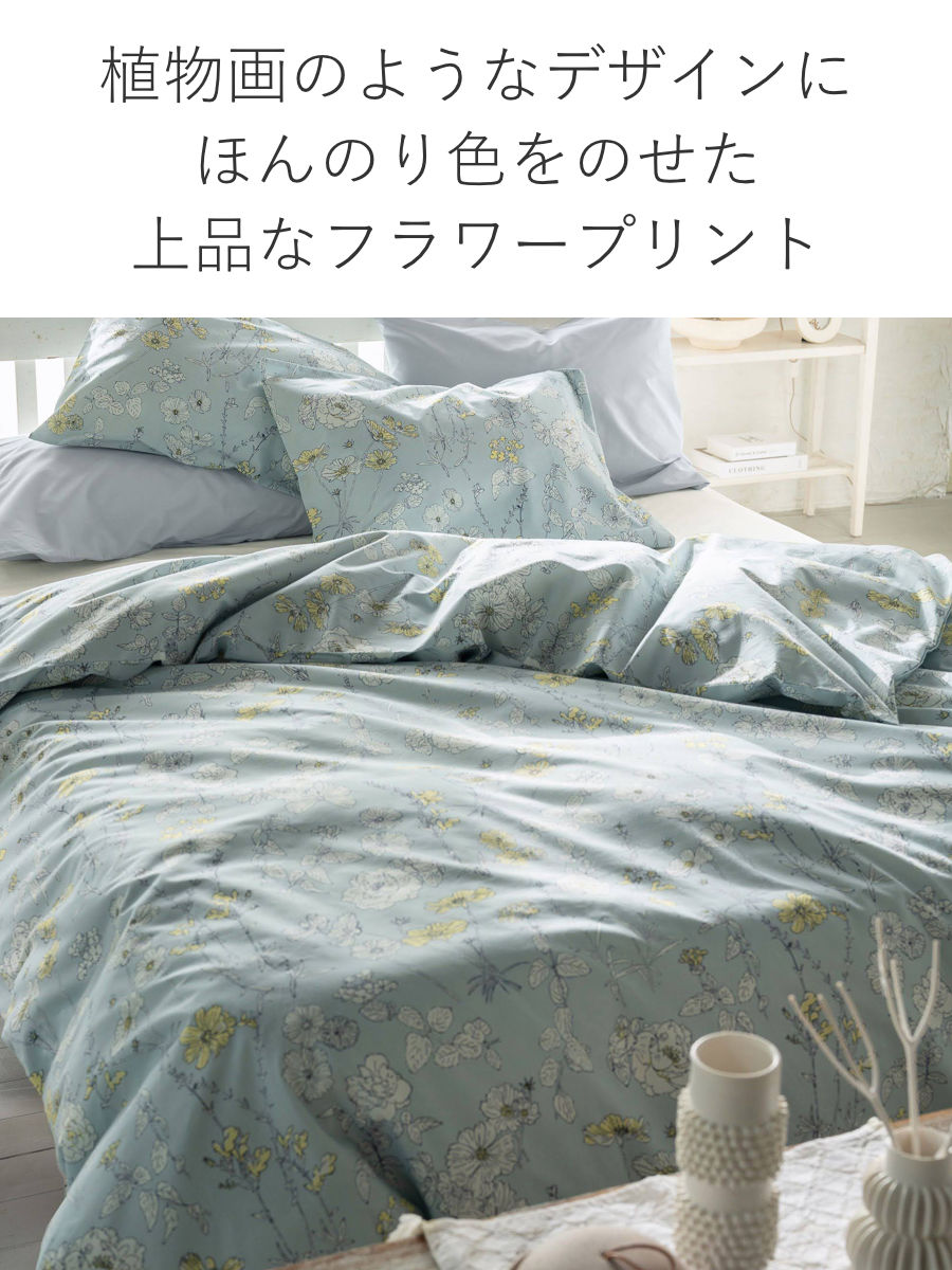 四季折々に咲く美しい花々を、細やかなラインで描いた植物画のようなデザインの掛け布団カバーです。花びらにふんわりと色をのせたシックなデザインが寝室を優しく彩り、毎日の眠りの時間を心地よく演出します。