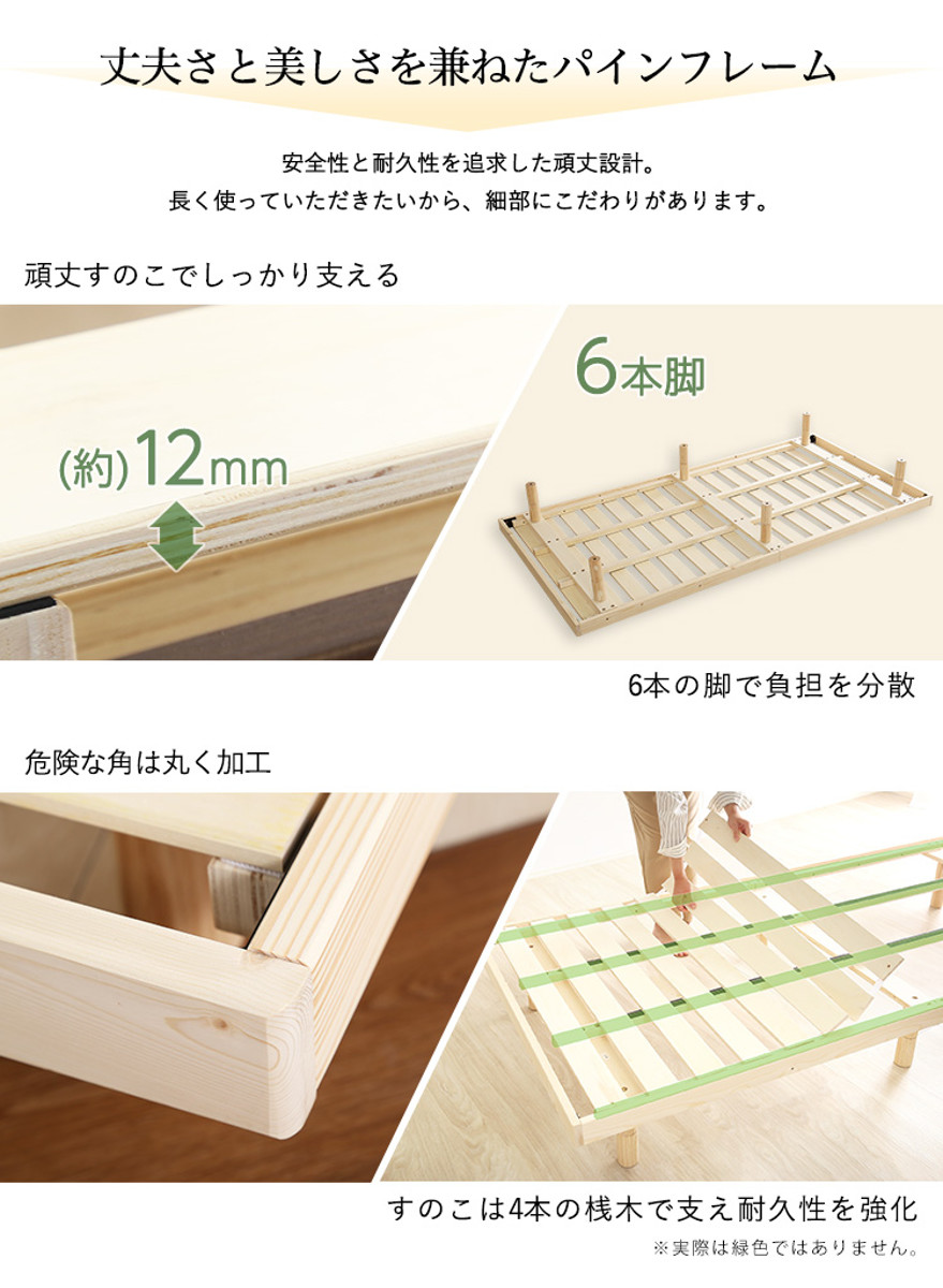| 材質 | 本体:天然木(パイン材) すのこ:合板(LVL) 表面材:ラッカー塗装(ホワイトウォッシュ、ブラウン)、無塗装(ナチュラル) |