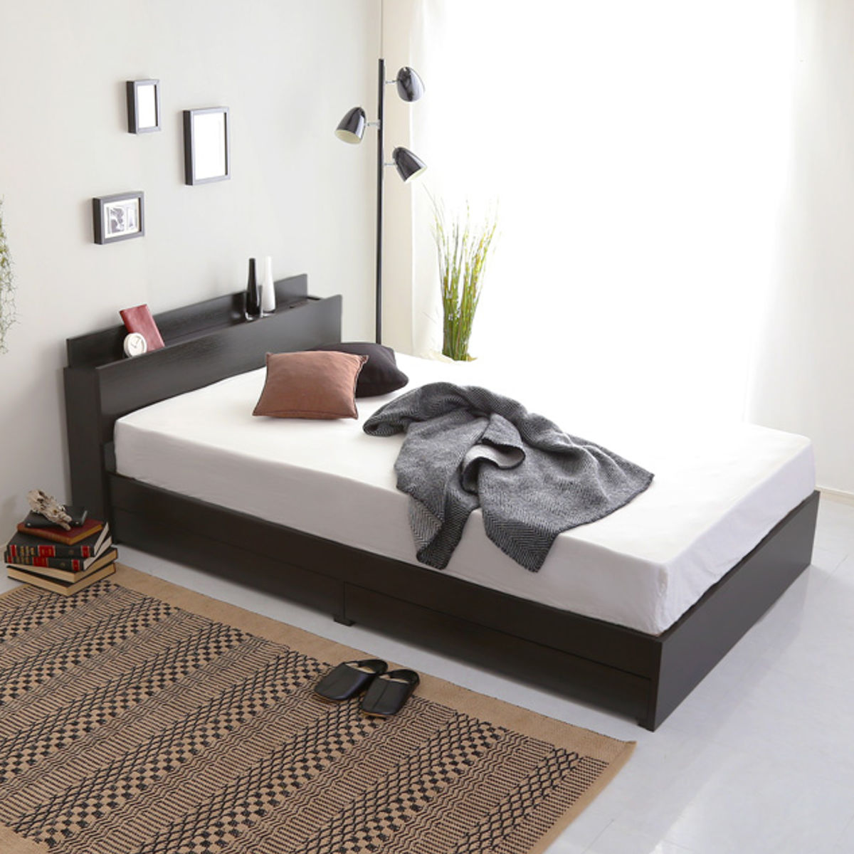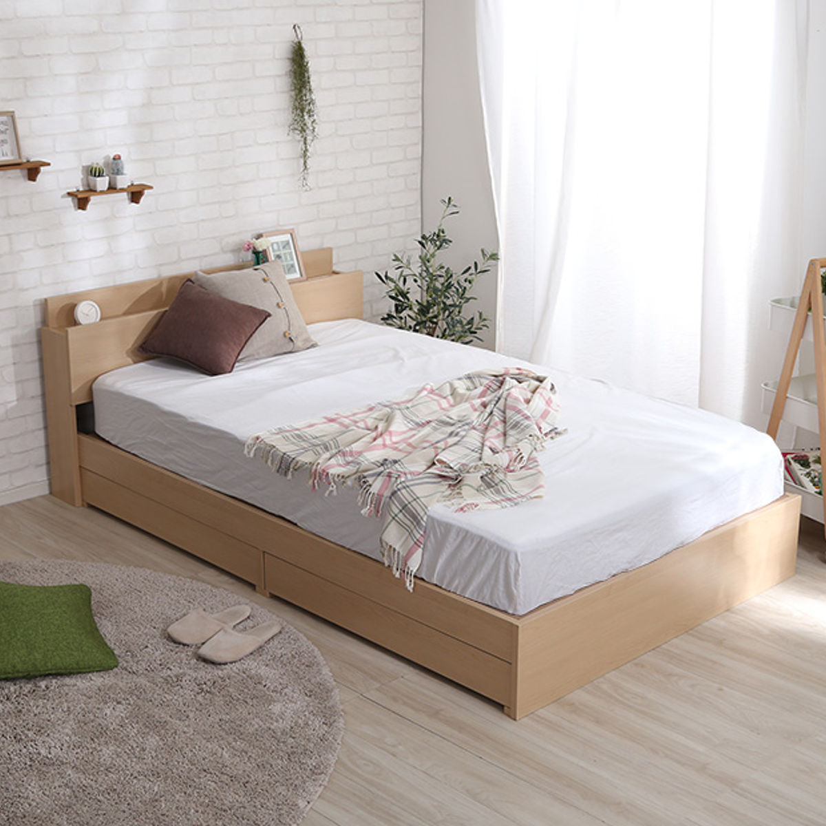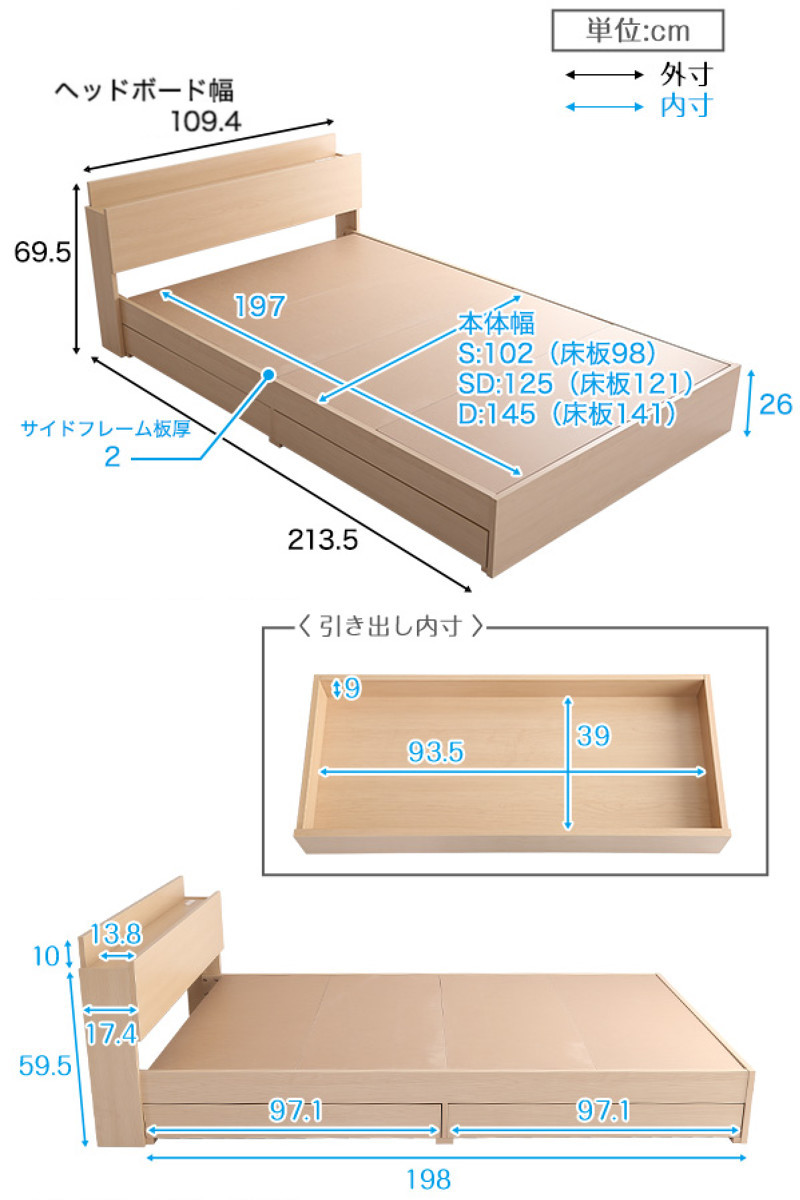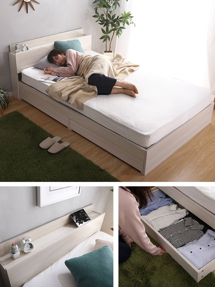 宮棚・2口コンセント・引出し収納を備えた多機能設計のチェストベッドです。収納場所の少ないワンルームやコンパクトなお部屋でも、ベッド下の収納スペースを使うとスッキリ整います。限られた空間を有効活用できる、暮らしに寄り添う一台です。