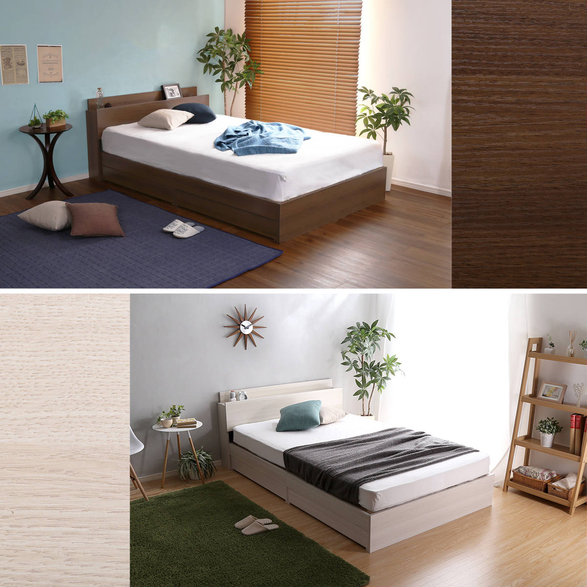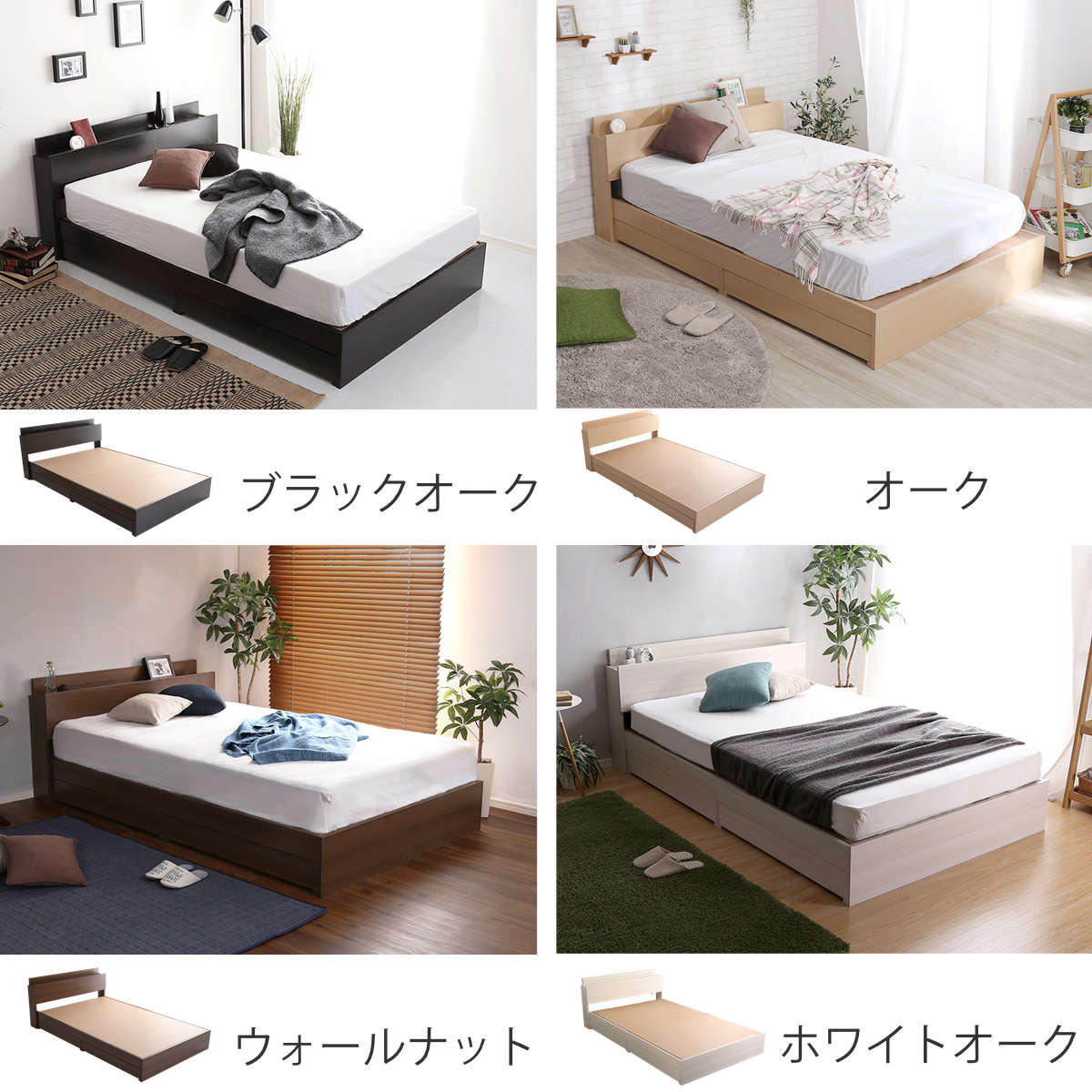 衣類や寝具をたっぷり収納できる引出しはベッド下の両サイドどちらにも取り付けることができます。引出しの代わりに収納ケースなどを使えば色々な物をベッド下に片付けることができます。