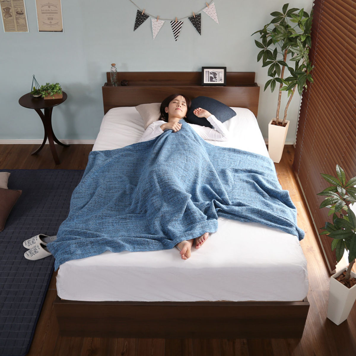 2口コンセントがついた宮棚は奥行が13.8cm。時計やメガネを置いたり、スマートフォンの充電や間接照明の使用など、就寝時やくつろぎ時間を快適にサポートします。