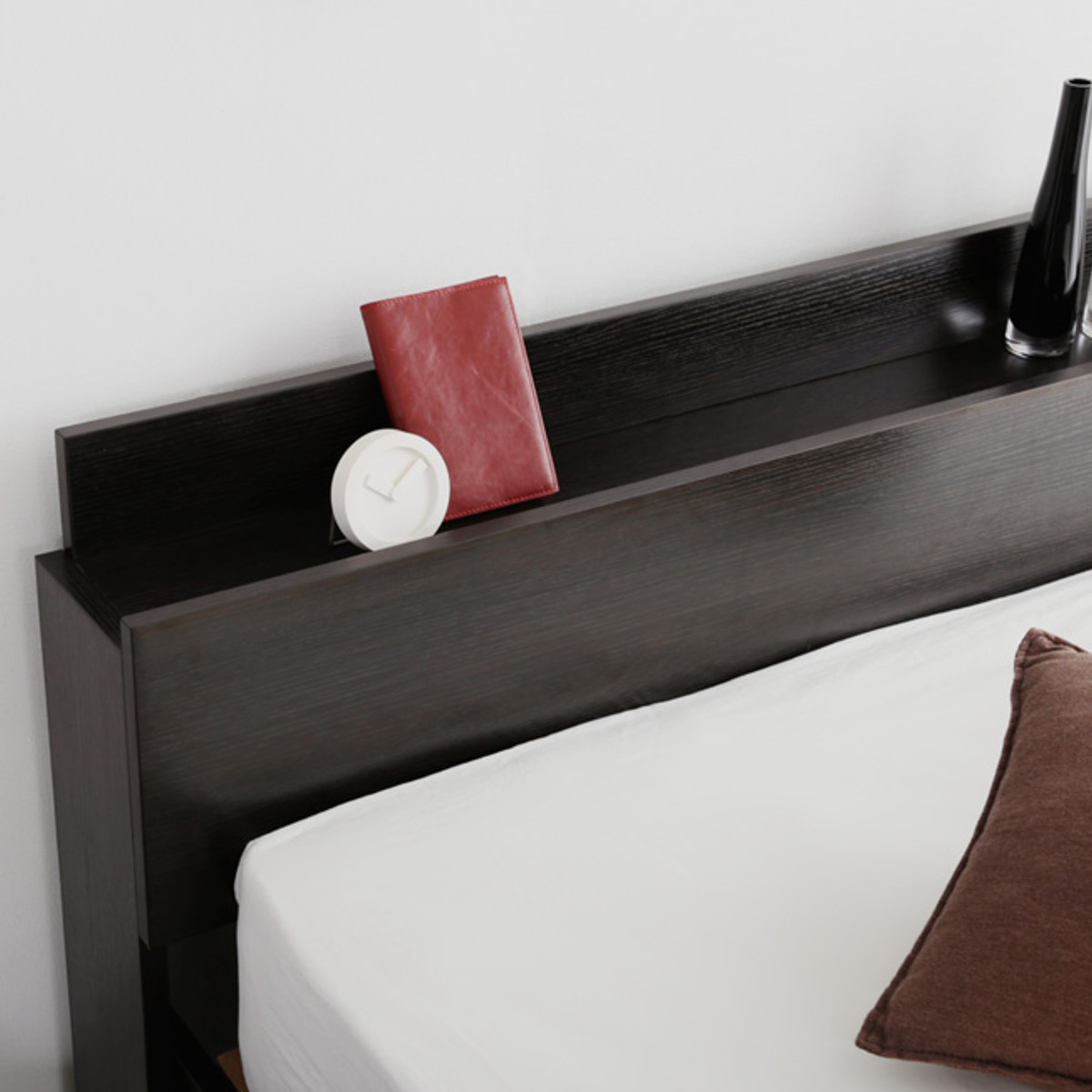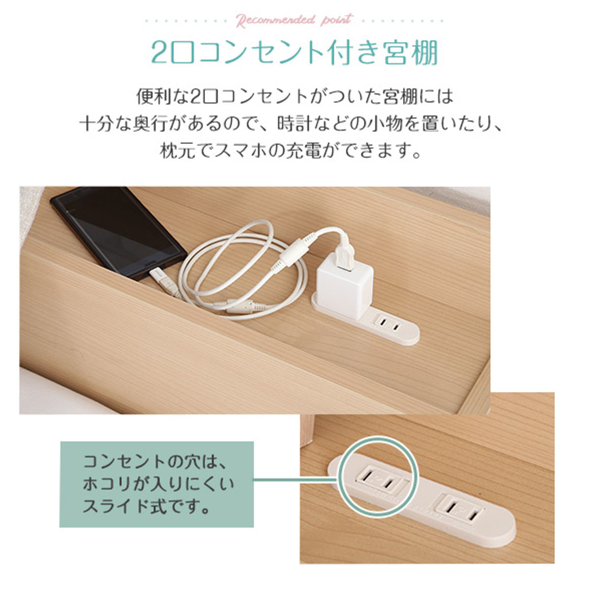 2口コンセントがついた宮棚は奥行が13.8cm。時計やメガネを置いたり、スマートフォンの充電や間接照明の使用など、就寝時やくつろぎ時間を快適にサポートします。