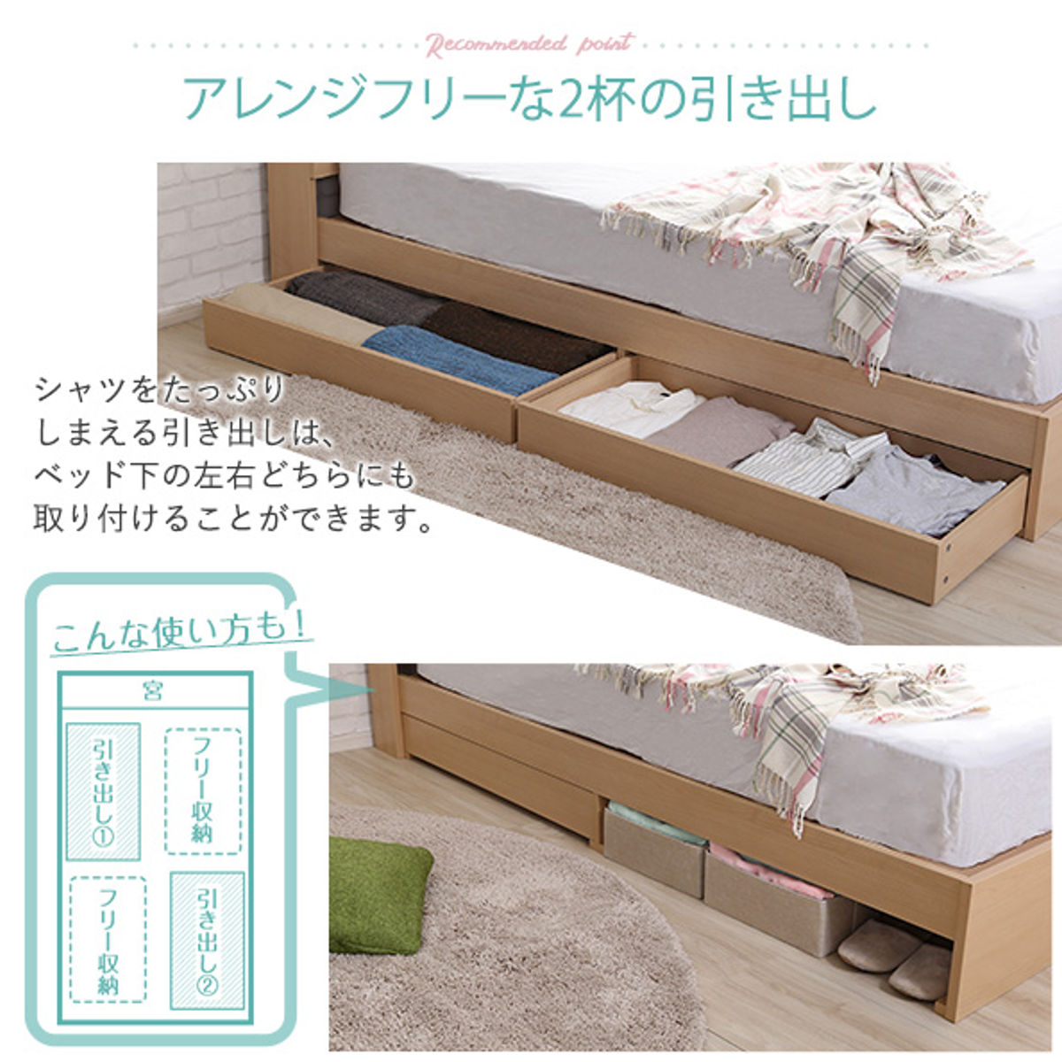 衣類や寝具をたっぷり収納できる引出しはベッド下の両サイドどちらにも取り付けることができます。引出しの代わりに収納ケースなどを使えば色々な物をベッド下に片付けることができます。