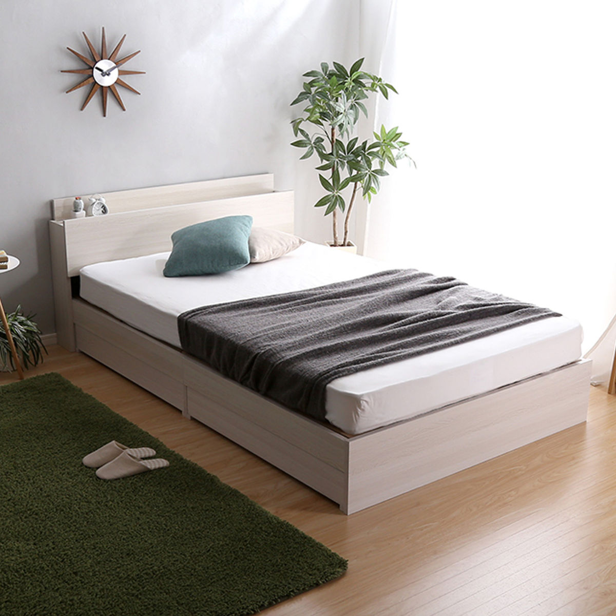 宮棚・2口コンセント・引出し収納を備えた多機能設計のチェストベッドです。収納場所の少ないワンルームやコンパクトなお部屋でも、ベッド下の収納スペースを使うとスッキリ整います。限られた空間を有効活用できる、暮らしに寄り添う一台です。